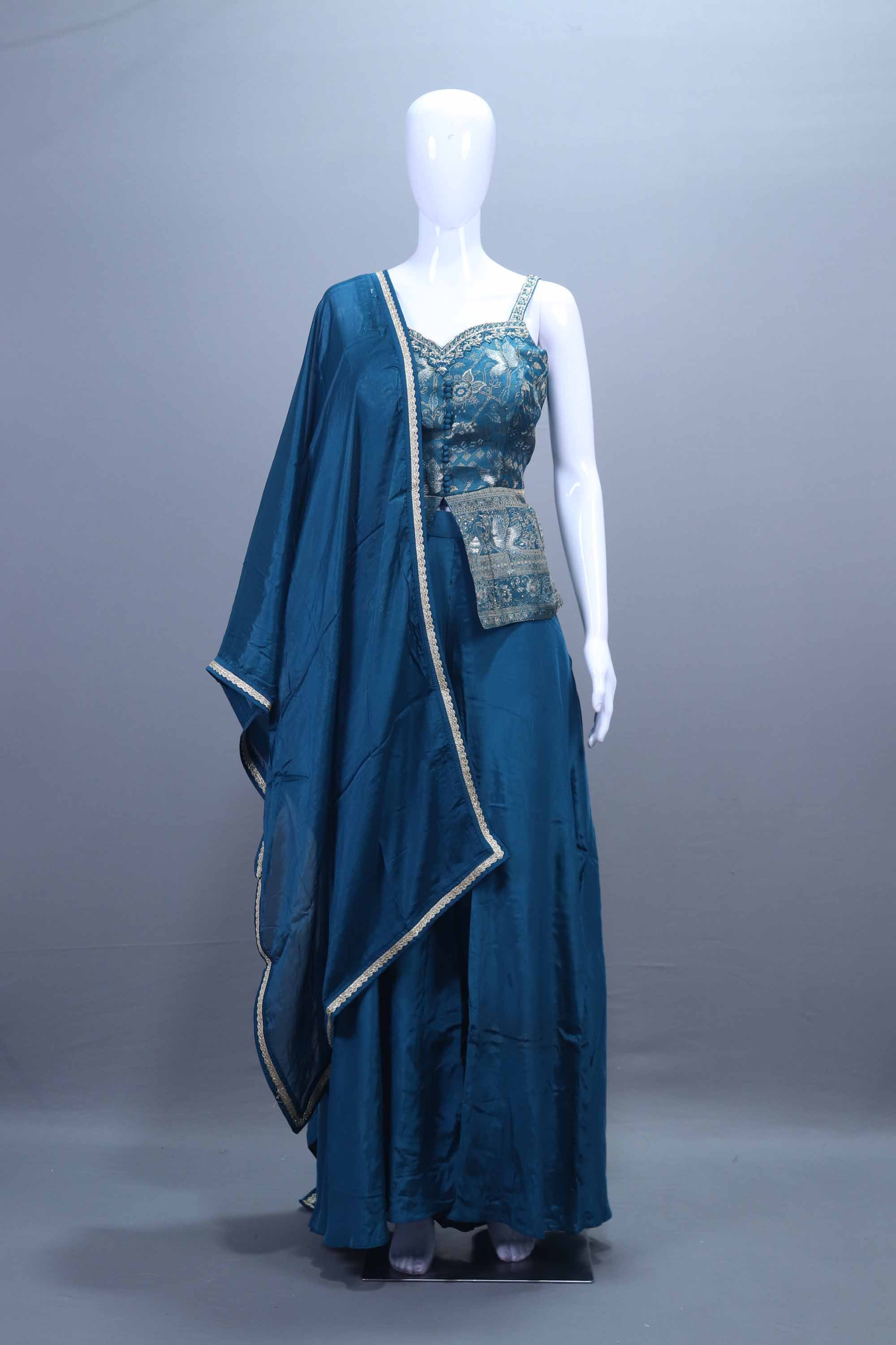 Enhance your festive look with this elegant Teal Embroidered Crop Top, Palazzo Dupatta Set Festive Wear Outfit a perfect blend of Indo-western style and traditional craftsmanship. The beautifully embroidered crop top features intricate threadwork and a flattering fit, paired with flowy palazzo pants that offer comfort and sophisticated movement. The matching dupatta with a delicate embroidered border completes the outfit with a refined, festive touch. Crafted from premium-quality fabric, this three-piece ensemble ensures a rich drape, vibrant color depth, and all-day comfort. Ideal for weddings, receptions, festive celebrations, sangeet, and special occasions, this ethnic set highlights grace, charm, and modern elegance.