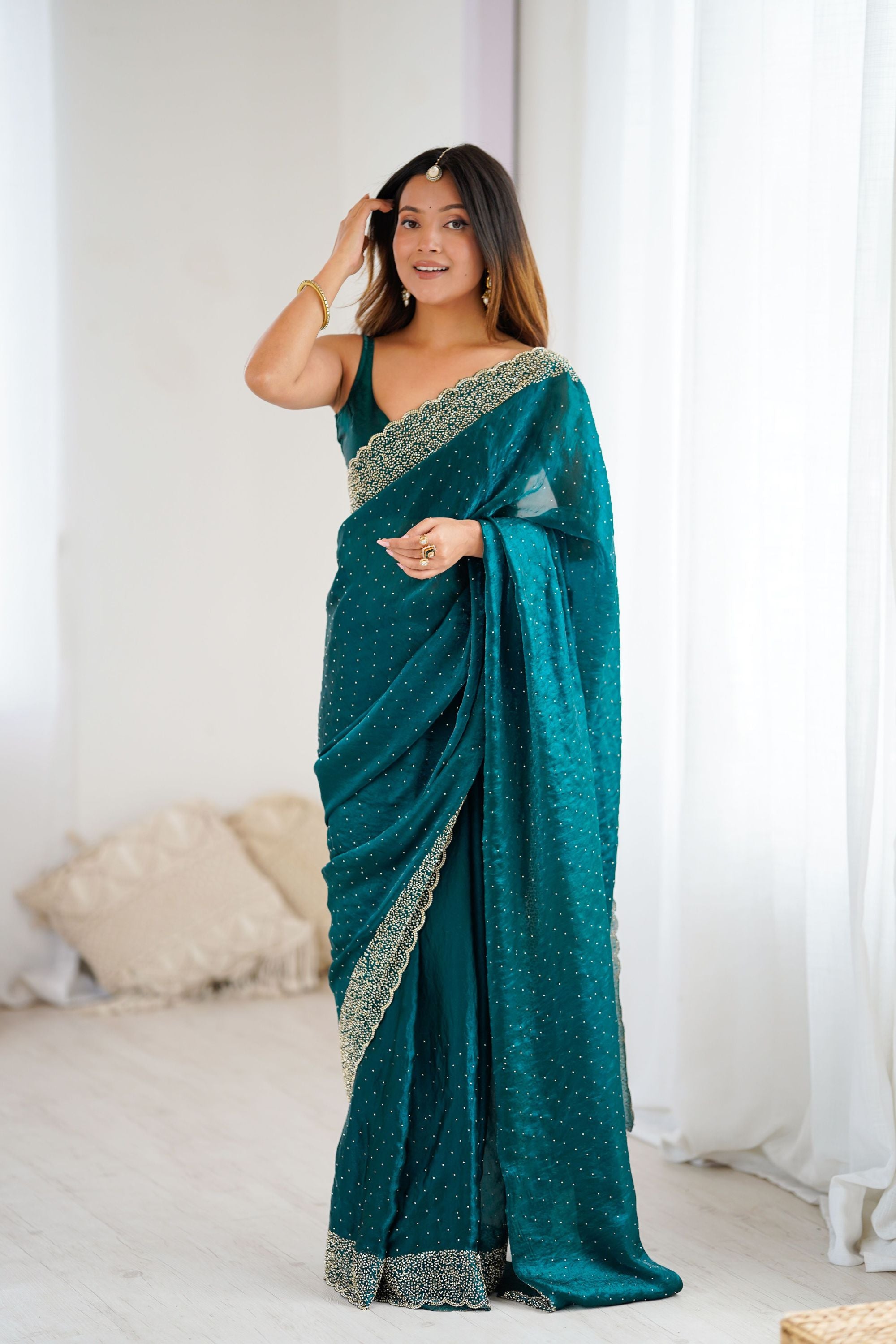 Elevate your ethnic wardrobe with this Teal Green Designer Georgette Saree with Heavy Golden Embroidered Border  designed for women who adore timeless sophistication and luxurious detailing. Crafted from premium chiffon fabric, this saree features fine sequin work throughout, adding a subtle shimmer perfect for festive celebrations, weddings, receptions, cocktails, and special occasions. The beautifully embroidered gold scalloped border enhances its regal appeal, while the rich teal tone flatters all skin tones and brings effortless grace to your look. Lightweight, flowy, and comfortable to drape, this saree offers both style and ease for long events. Pair it with statement jewelry and heels for a complete glamorous ensemble.