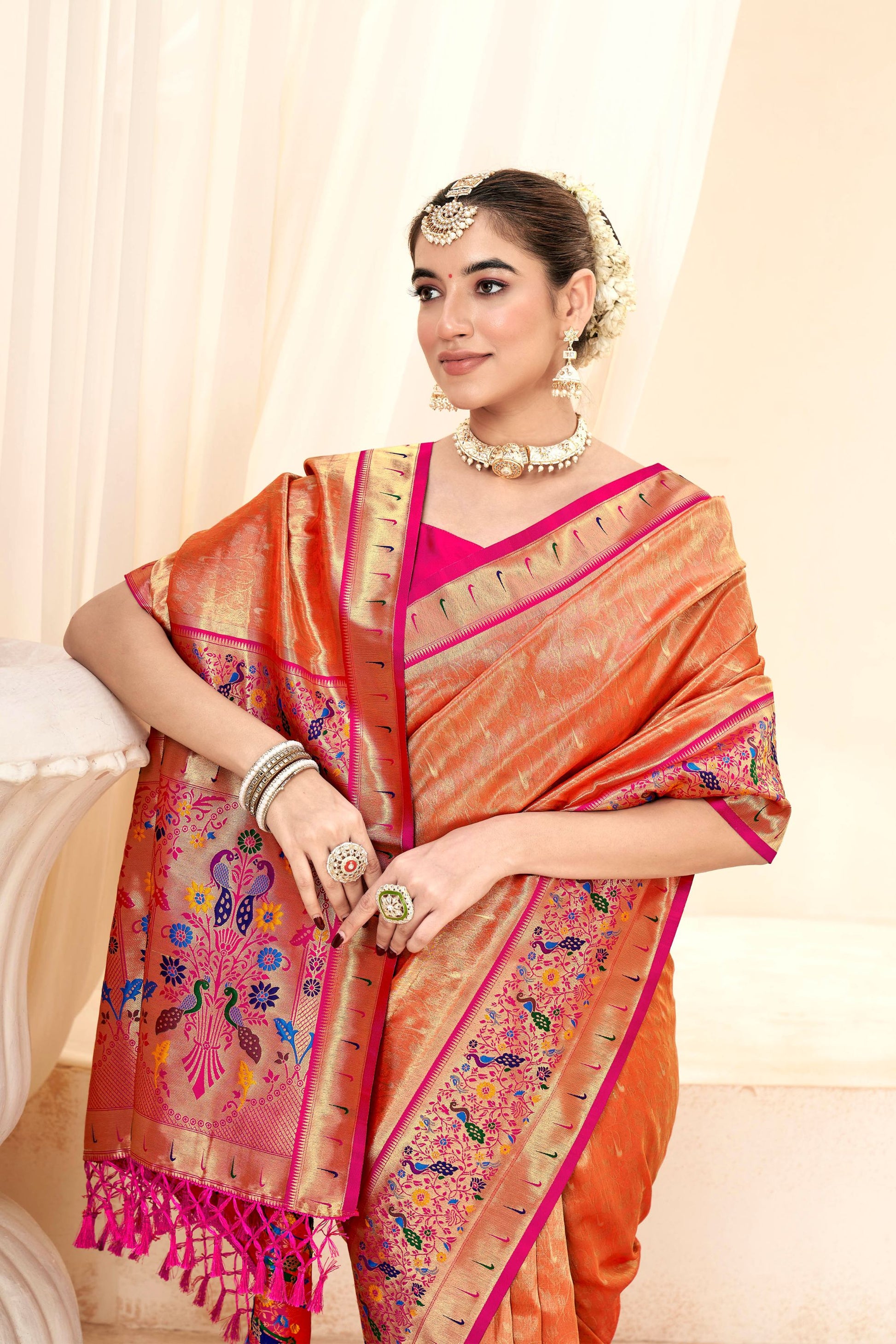 Traditional Orange Banarasi Silk Saree with Pink Contrast Blouse Festive Wear