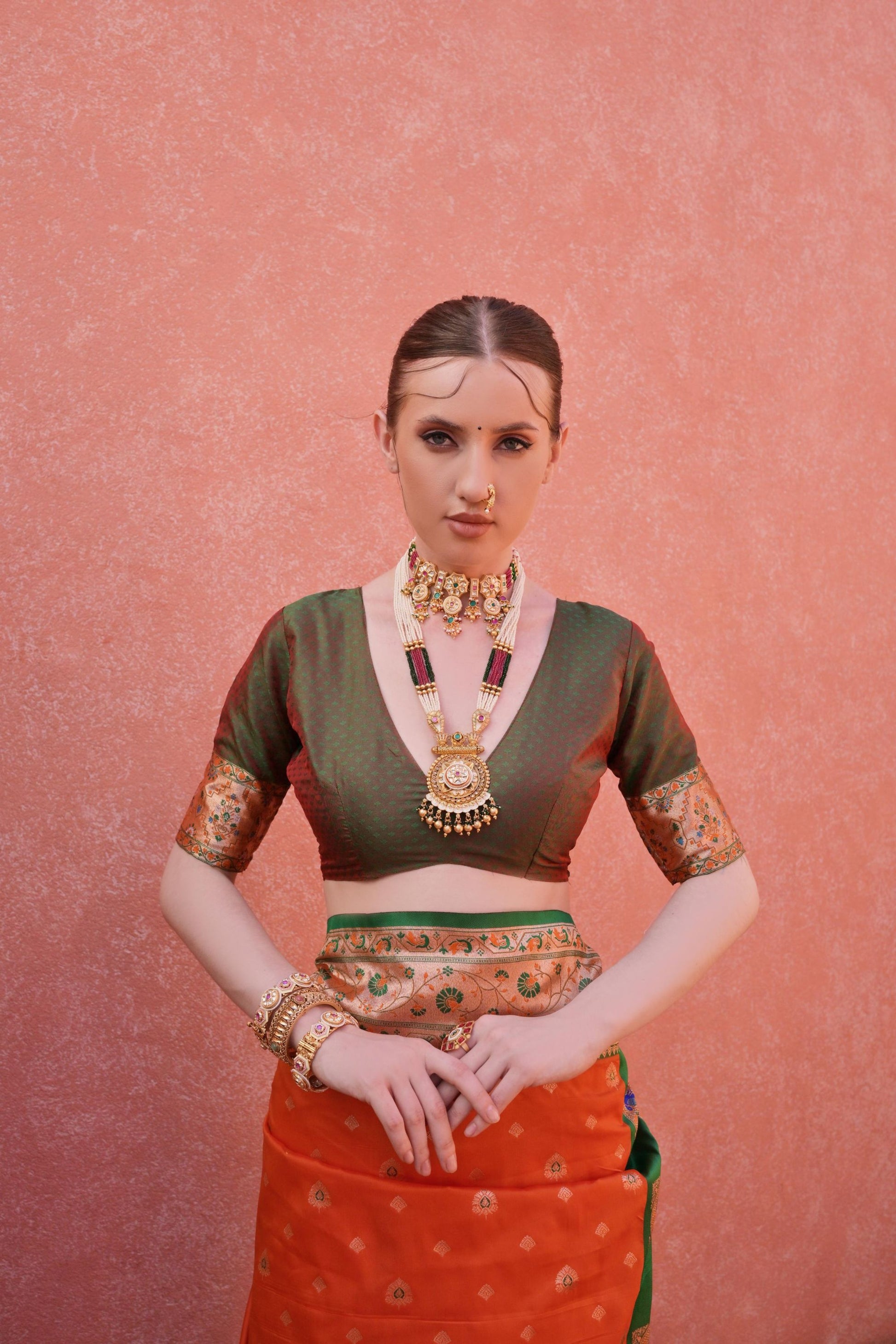 Traditional Orange Green Banarasi Silk Saree Zari Border Rich Designer Pallu