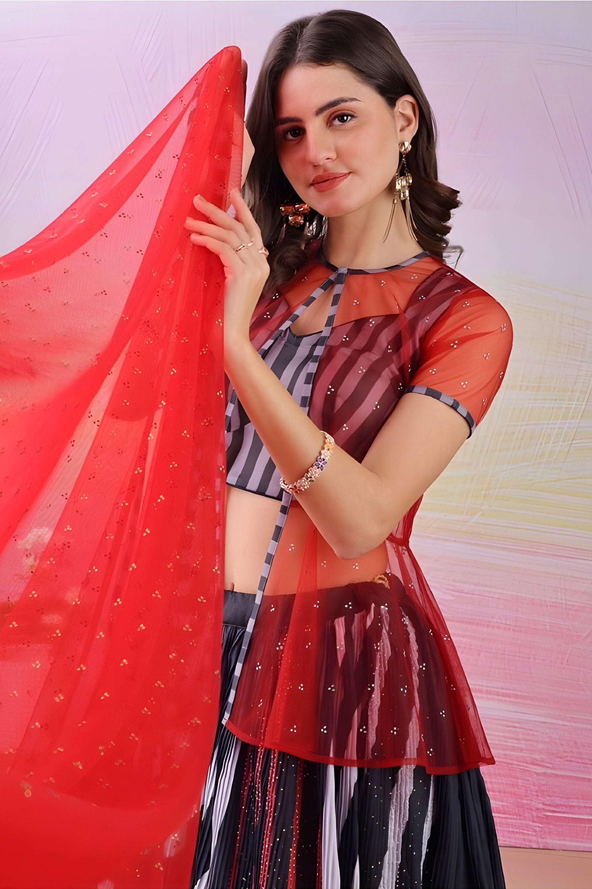 Trendy Black and White Digital Print Satin Lehenga Choli with Red Sheer Jacket