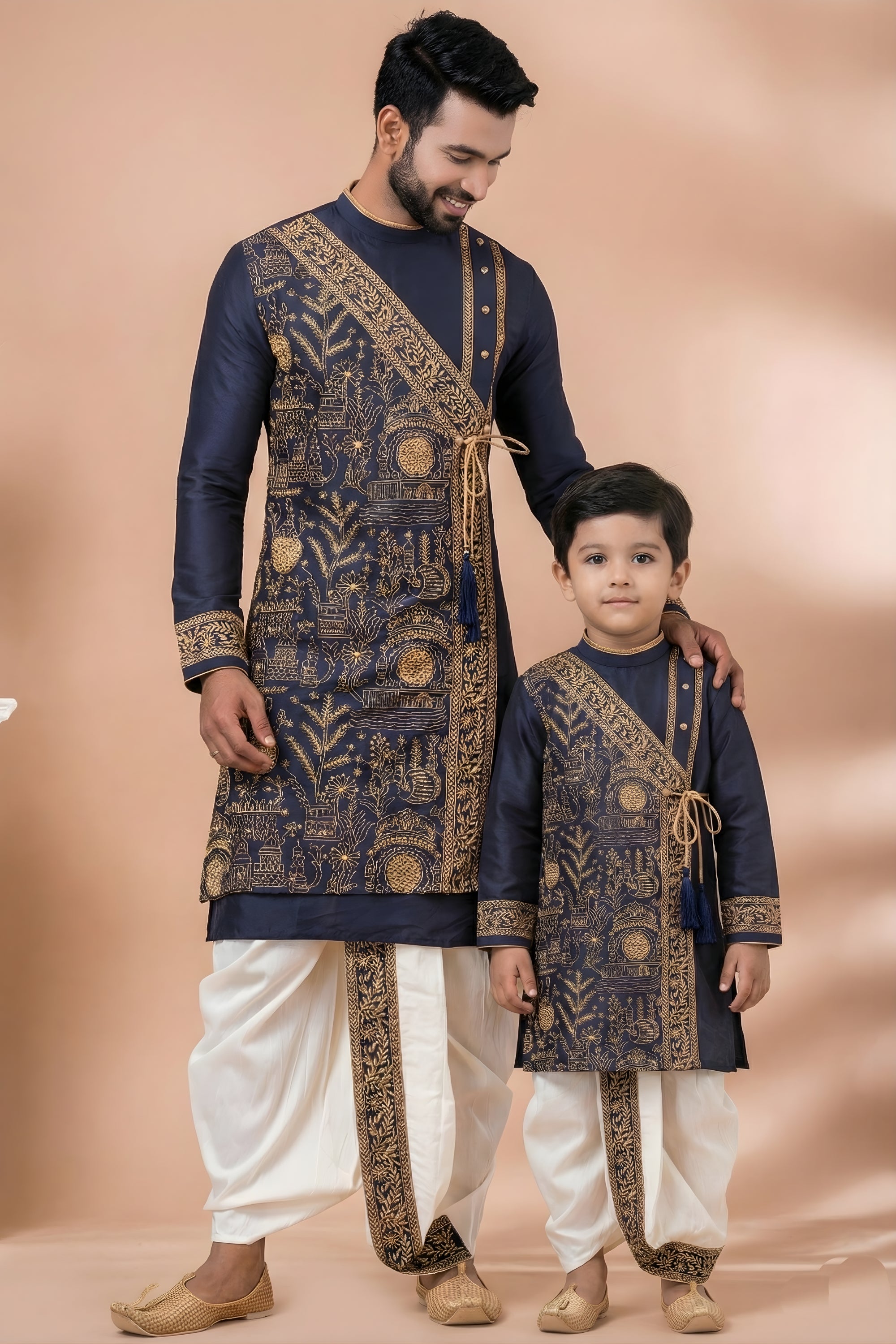 Elevate your festive style with this Royal Navy Blue Viscose Embroidered Kurta Dhoti Set for Father & Son, designed to bring together elegance, tradition, and modern sophistication. Crafted from premium-quality viscose fabric, this matching ethnic wear set offers a smooth finish, breathable comfort, and a graceful drape for both men and kids. The navy blue kurta is richly detailed with intricate golden traditional embroidery and heritage-inspired motifs, highlighted by a stylish diagonal panel that adds a regal touch. Paired with classic white dhoti pants featuring coordinated embroidered borders, this ensemble reflects exquisite Indian craftsmanship. Ideal for weddings, festive occasions, pooja ceremonies, family functions, and cultural celebrations, it ensures a polished and festive appearance.