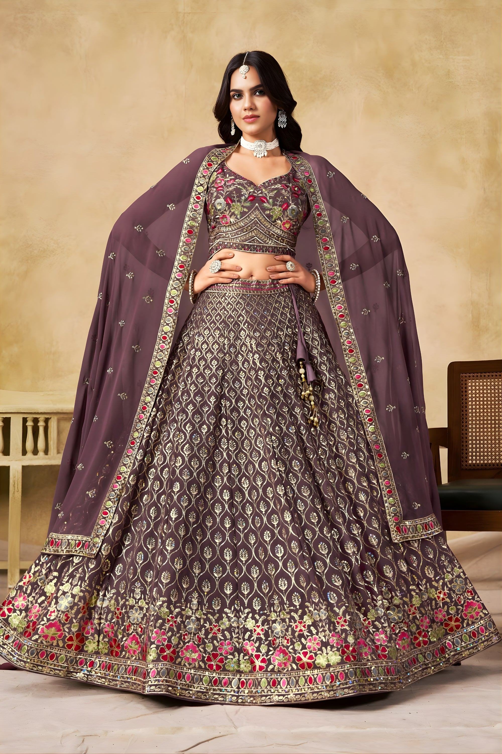 Make a regal style statement with this Trendy Purple Georgette Lehenga Choli, beautifully crafted for weddings, receptions, festive events, and grand celebrations. This luxurious outfit features rich golden zari embroidery, vibrant floral thread work, and sparkling sequins, creating a perfect blend of tradition and contemporary elegance. The embroidered choli showcases detailed floral motifs in striking shades that complement the deep purple base. The flared lehenga is adorned with an intricate golden leaf pattern, finished with a heavily embroidered floral border that adds charm and sophistication. Paired with a matching purple dupatta featuring an embellished border and scattered buti work, this ensemble completes a graceful, royal look.