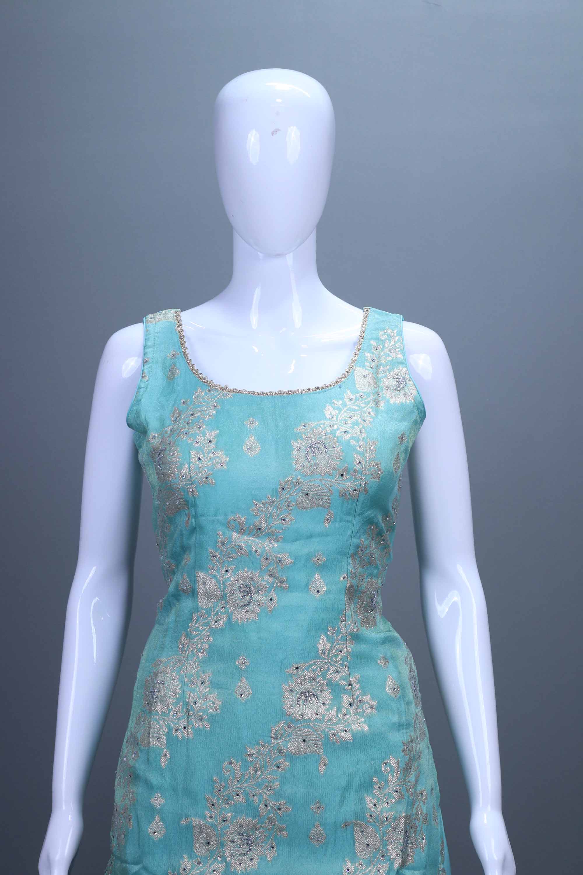 Designed with intricate golden thread embroidery, this sleeveless kurta pairs beautifully with a flowy Turquoise Embroidered Kurta Sharara Set with Dupatta Festive Wear The rich color and detailed craftsmanship make it a perfect choice for weddings, engagements, festivals, and special celebrations. Crafted from premium fabric, this ethnic set offers both comfort and sophistication. The dupatta features delicate border detailing, adding a refined finishing touch to the ensemble. Whether you’re attending a daytime function or an evening event, this outfit ensures a graceful and stunning appearance.