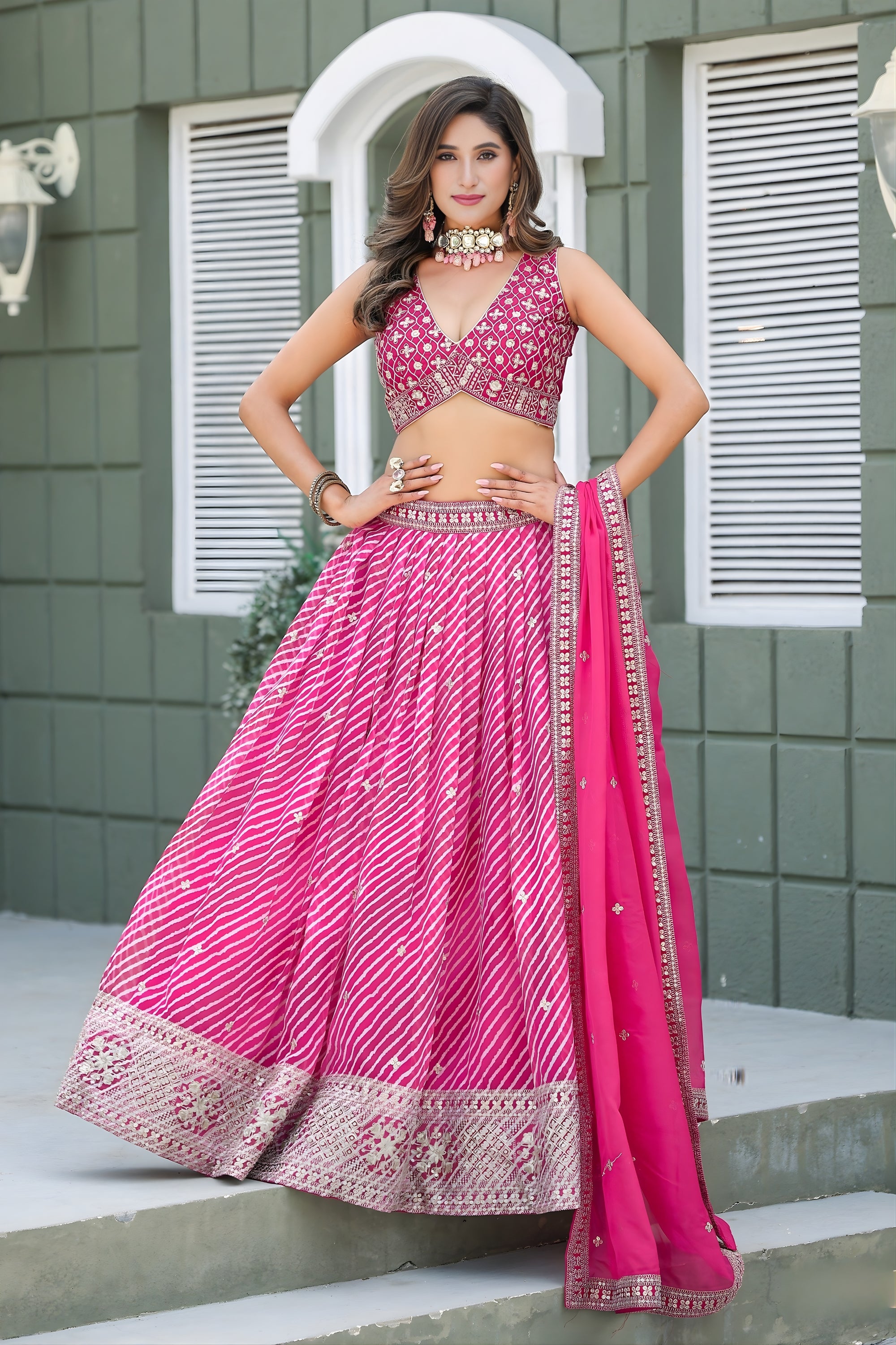 Elevate your festive and wedding wardrobe with this vibrant pink Bandhani print lehenga choli, designed to make a stunning style statement. The lehenga features beautiful diagonal Bandhani patterns, enhanced with delicate zari and sequin embellishments for a graceful shimmer. The broad intricately embroidered hemline adds richness and traditional charm to the outfit. The sleeveless choli is crafted with detailed thread and sequin embroidery, offering a modern yet ethnic appeal with its flattering V-neck design. Paired with a matching pink dupatta highlighted with elegant embroidered butti work and a designer border, this ensemble is perfect for weddings, sangeets, festive celebrations, and special occasions.