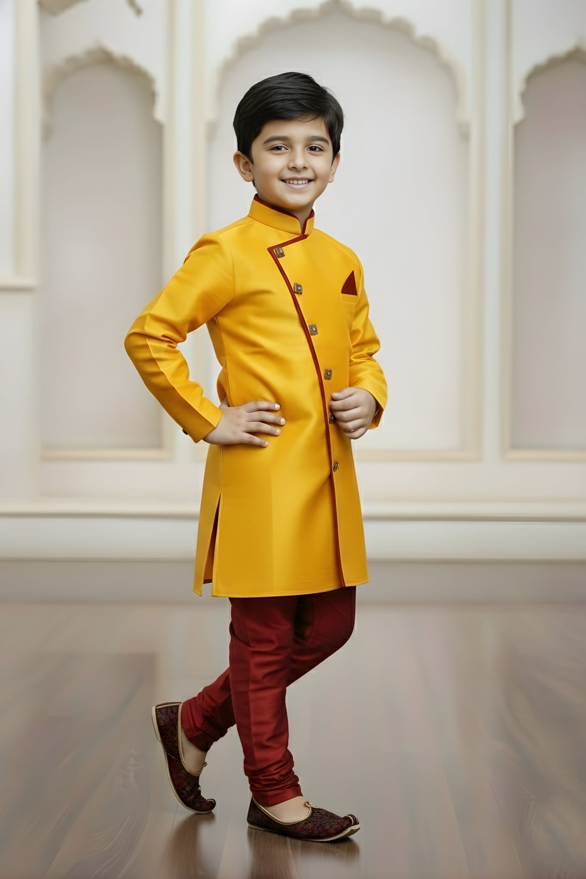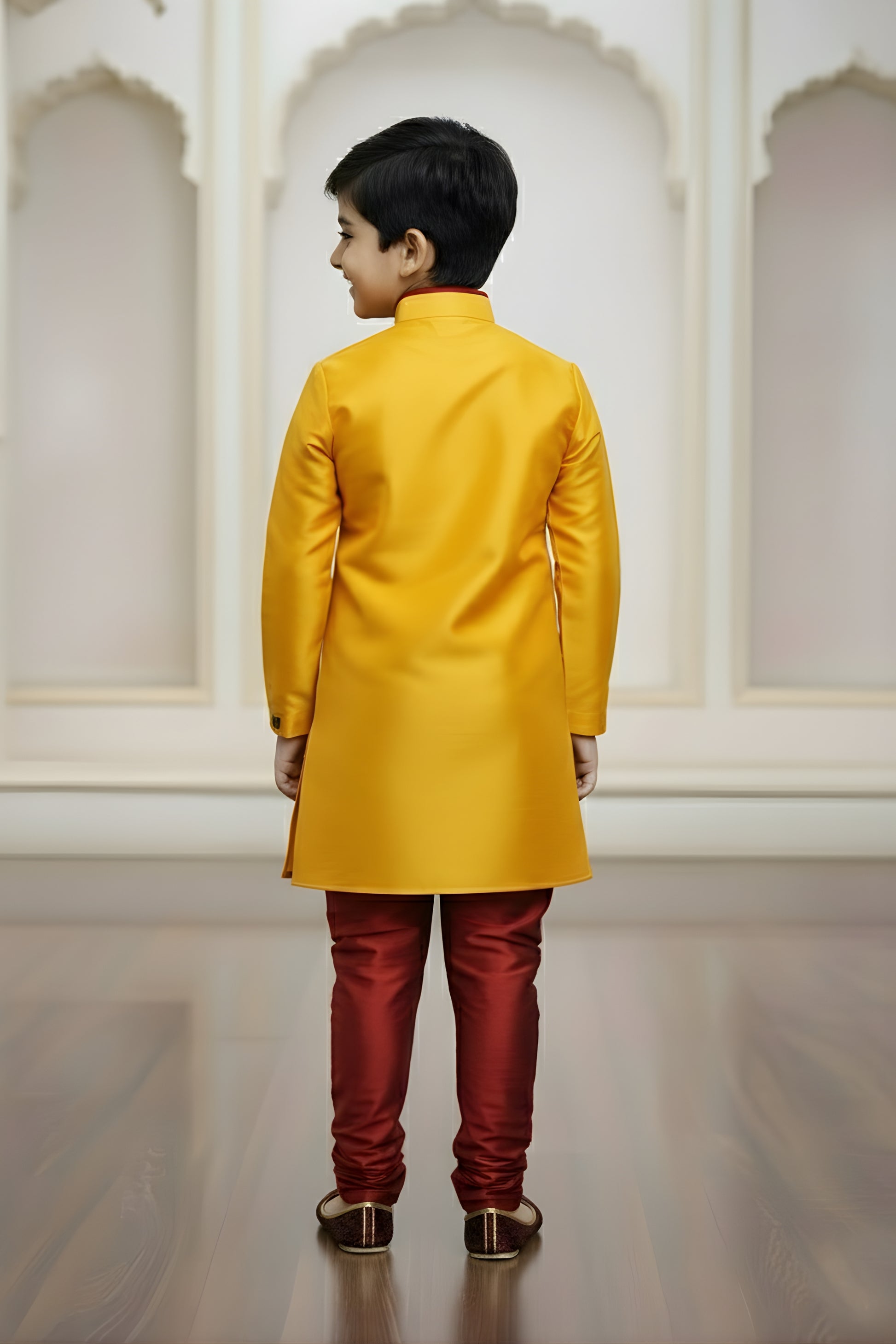 Vibrant Yellow Boys Indo Western with Maroon Pyjama For Wedding Wear