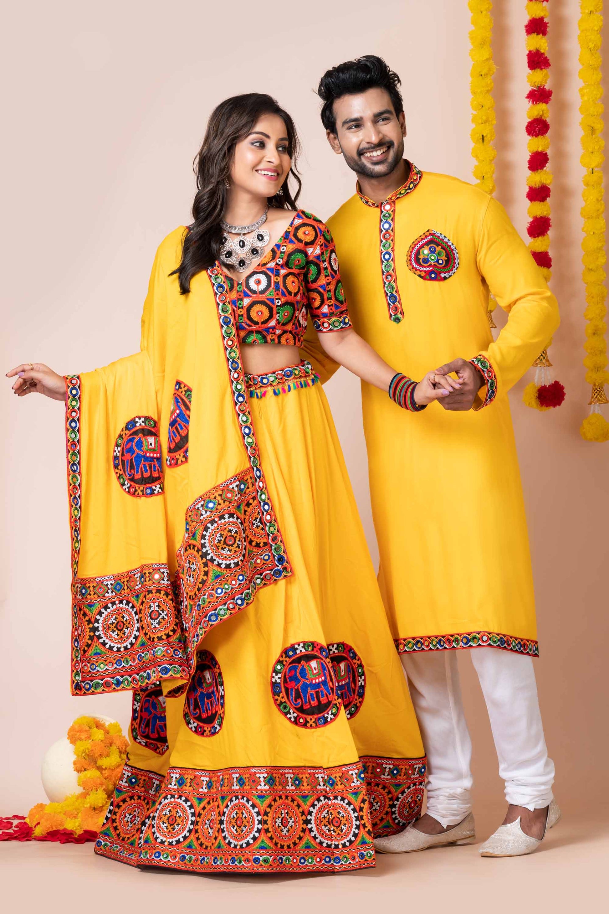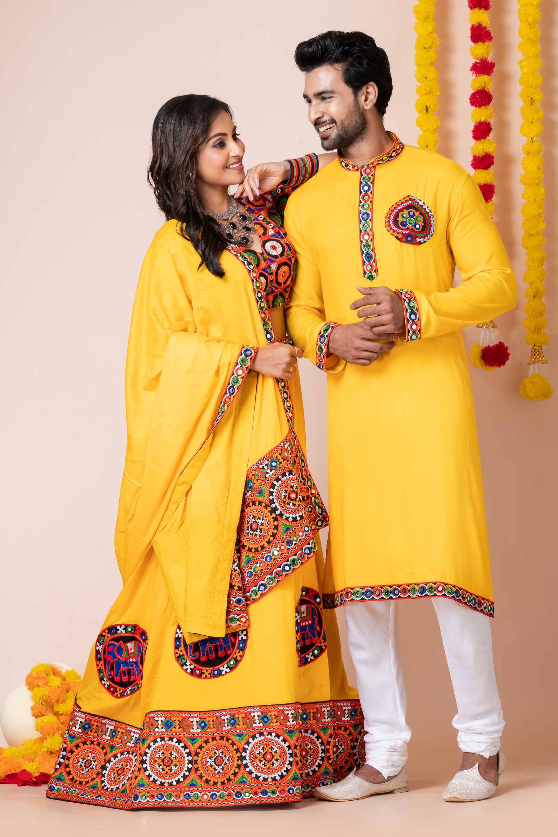 Turn heads this festive season with this stunning Yellow Rayon Couple Outfit, specially designed for Garba and Dandiya nights. The women's lehenga choli set is adorned with intricate multicolor Kutchi mirror embroidery, vibrant thread work, and statement elephant motifs that reflect traditional Gujarati craftsmanship. The matching men's kurta complements the look with coordinated embroidery on the collar, sleeves, and chest patch, crafted in breathable rayon for all-night comfort. Perfect for Navratri, Garba, festive events, and traditional occasions, this coordinated couple set brings vibrant elegance and cultural charm. The lightweight fabric ensures ease of movement, making it ideal for dance and celebration.