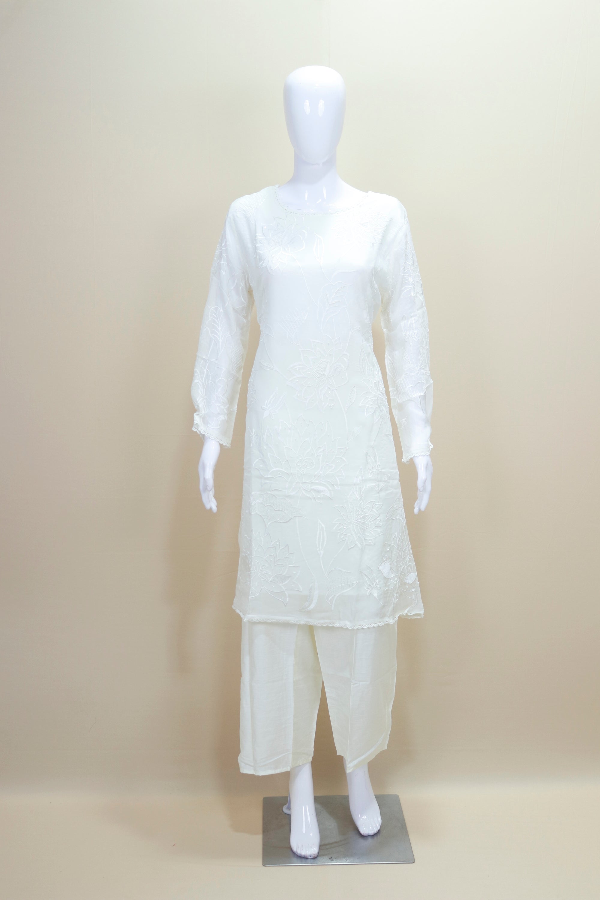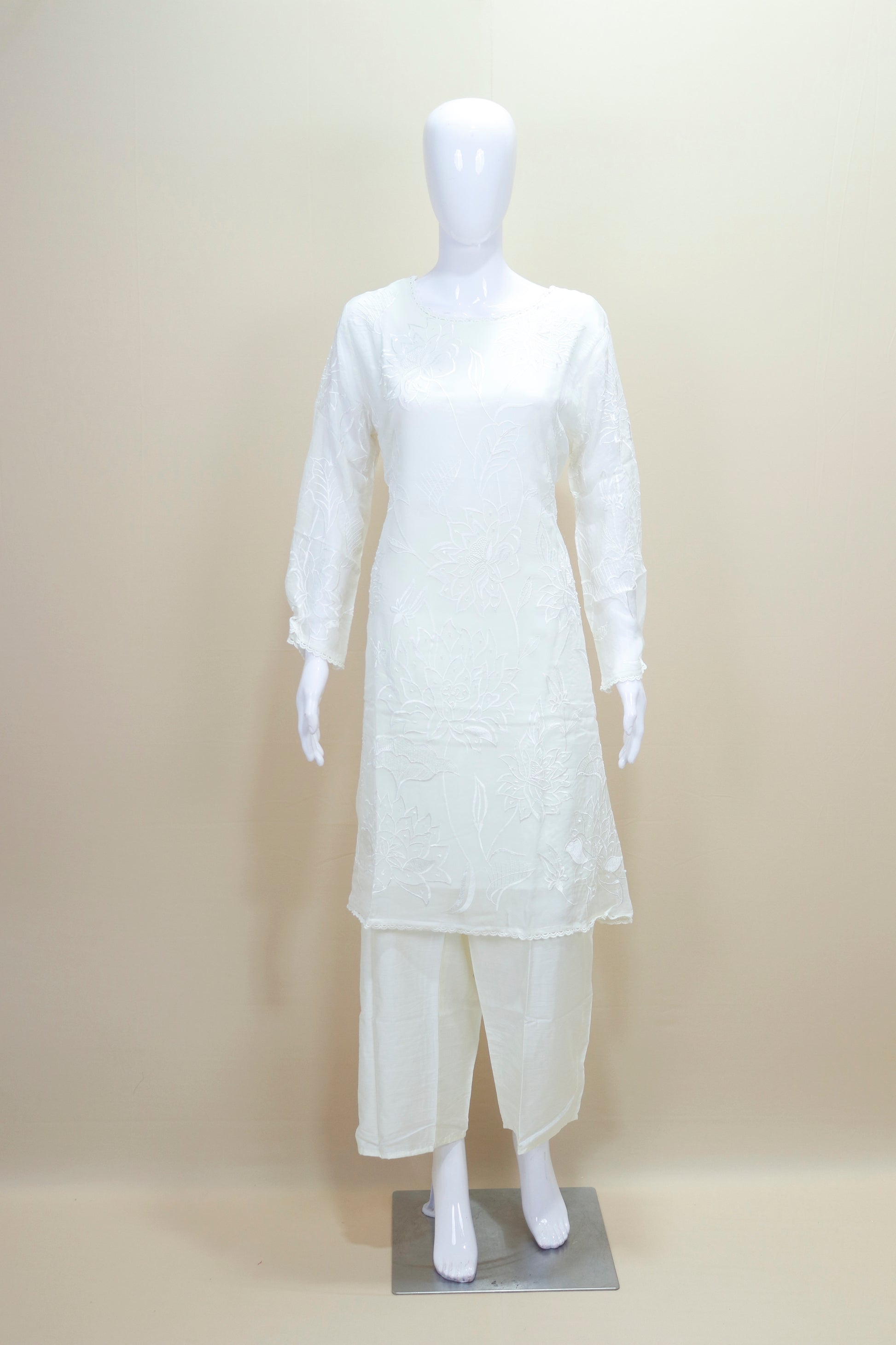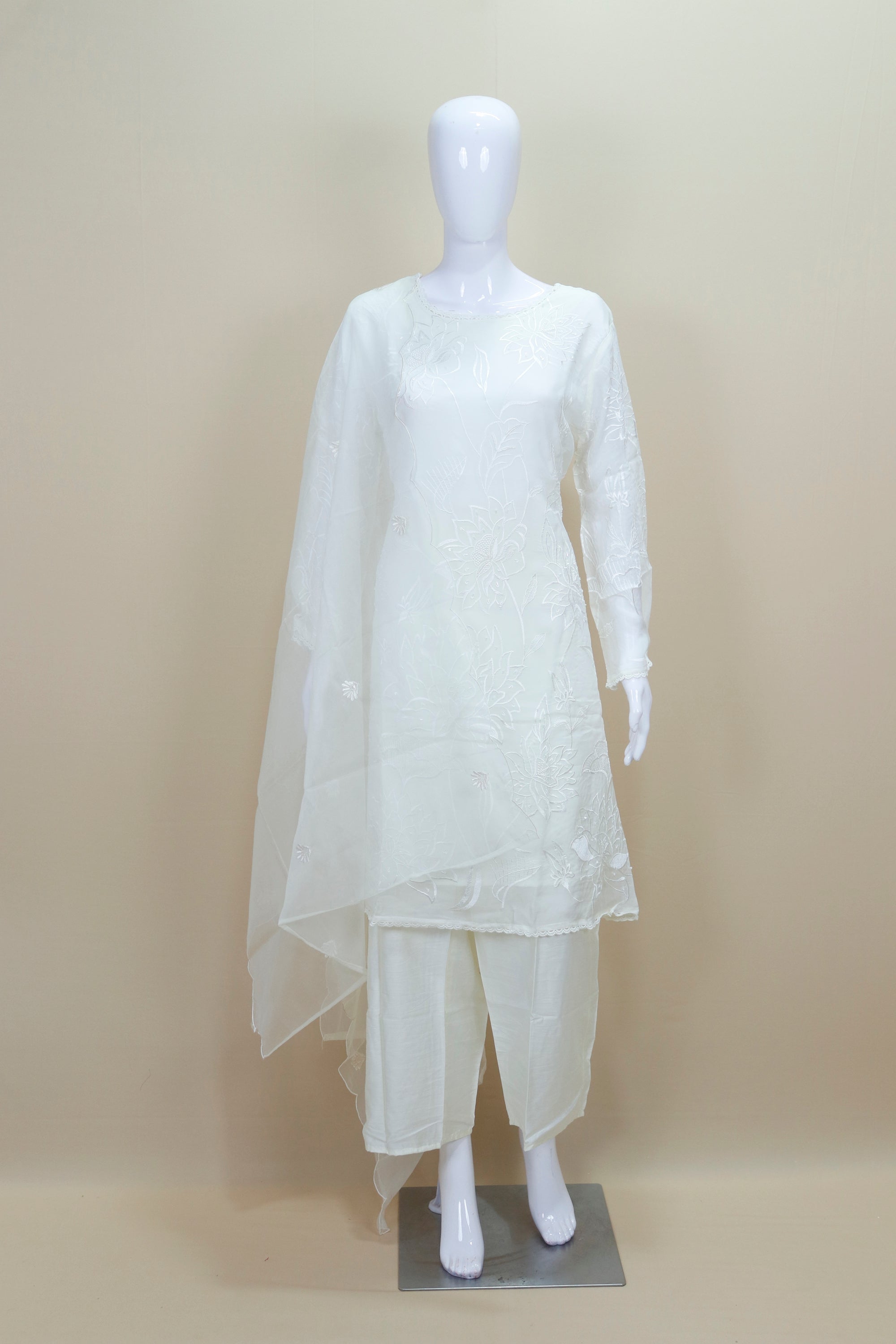 Radiate grace and sophistication White Chikankari Cotton Kurta Set with Dupatta Elegant Ethnic Wear designed to keep you effortlessly elegant. The straight-cut kurta features intricate hand-embroidered Chikankari work, showcasing delicate floral patterns that exude traditional charm. Paired with comfortable cotton pants and a matching organza dupatta, this three-piece set blends simplicity with classic Indian craftsmanship. Perfect for casual outings, festive gatherings, and daytime functions, this breathable cotton suit set is a wardrobe essential for women who appreciate comfort without compromising on style. Style it with minimal jewelry and juttis for a refined ethnic look.