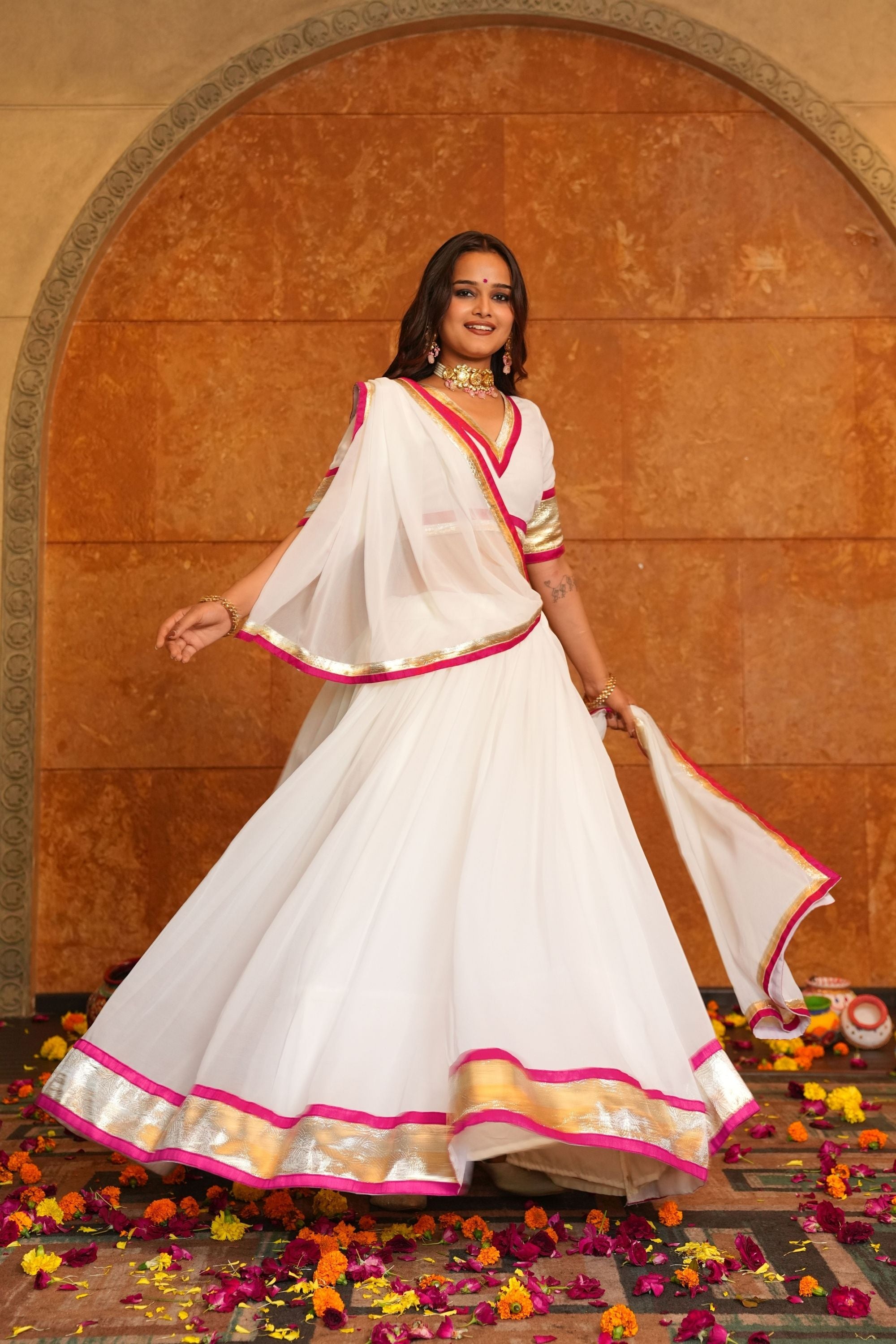 Radiate elegance and grace with this Women's White Georgette Lehenga Choli with Pink and Gold Border, perfect for weddings, festive occasions, and cultural celebrations. Made from premium quality georgette, this stunning lehenga features a flowing white skirt with a rich golden border highlighted by a vibrant pink trim, adding a refreshing pop of color to the classic design. The matching blouse comes with a deep V-neckline and golden-bordered sleeves, creating a sophisticated yet festive look. The lightweight georgette dupatta is adorned with matching pink and gold borders, completing this timeless ensemble. Designed for comfort and effortless movement, this lehenga choli is ideal for long wedding events, sangeet nights, or festive gatherings.