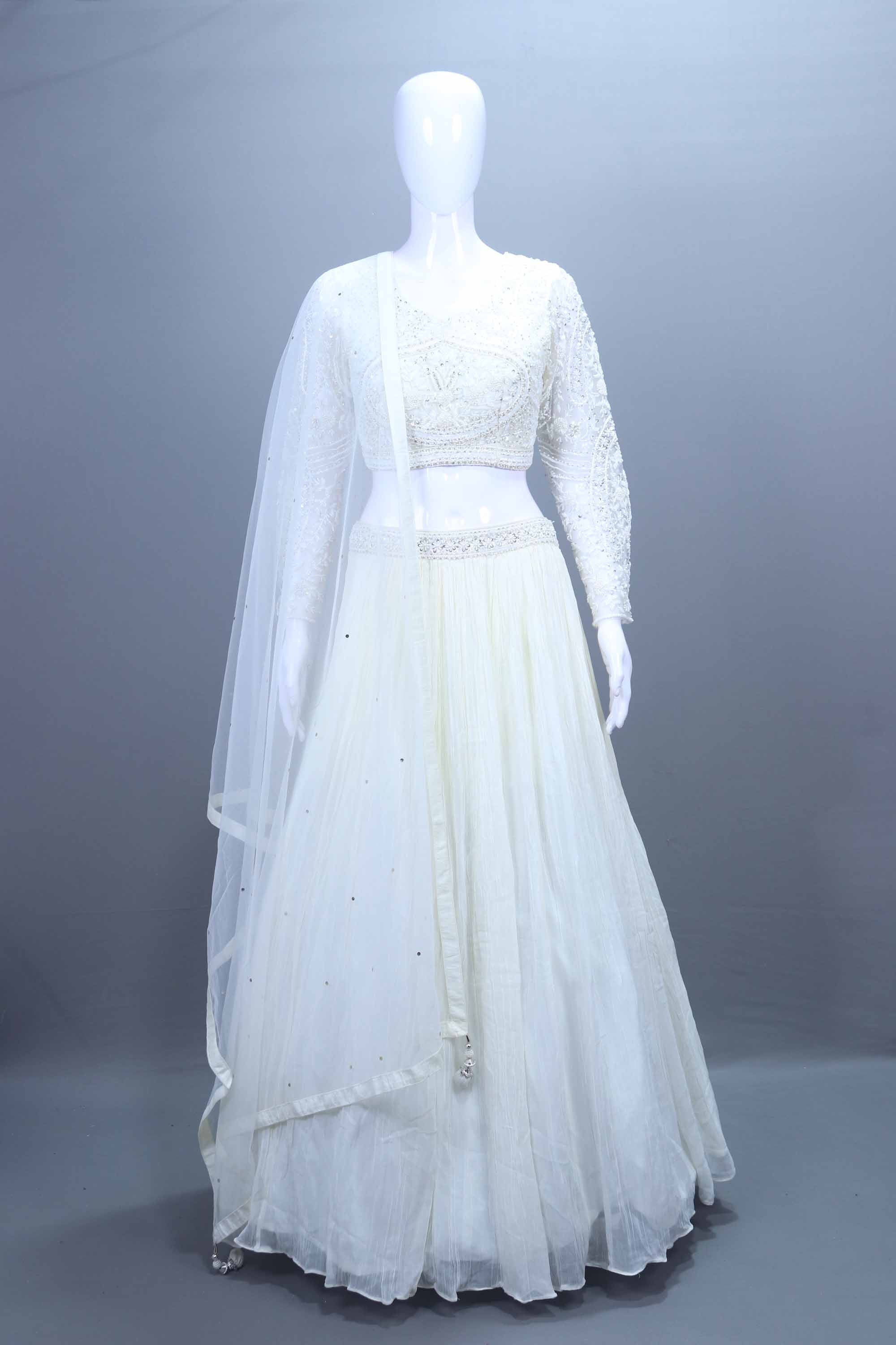 White Embroidered Net Lehenga Set with Full Sleeve Blouse and Dupatta