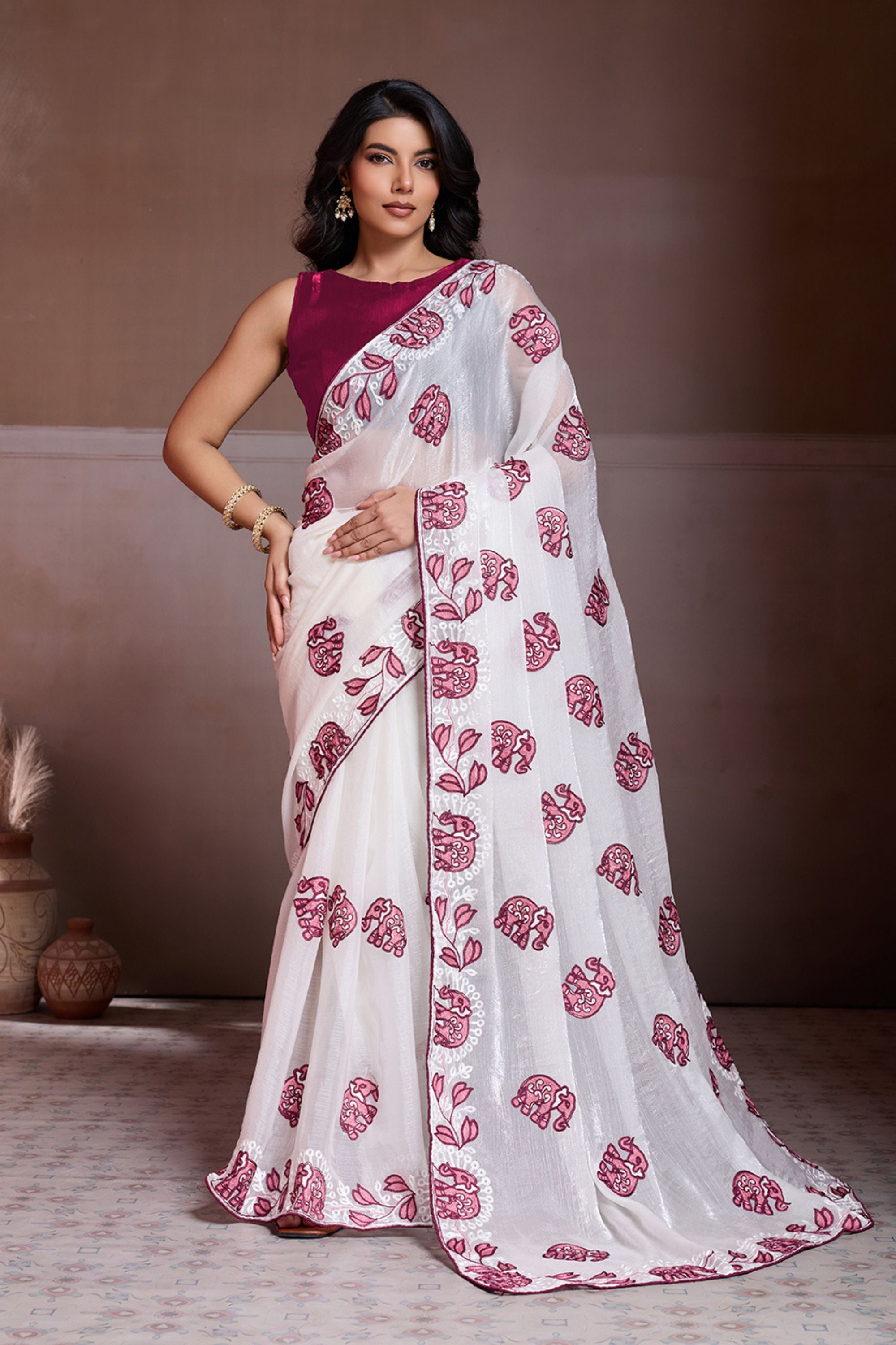 Add a touch of elegance to your ethnic wardrobe with this White Organza Saree Maroon Elephant Motif Print Embroidered Border Crafted from lightweight and breathable organza fabric, this saree offers a graceful drape and a soft sheen that enhances your festive and party looks. The all-over elephant-inspired traditional print adds a charming ethnic appeal, while the beautifully embroidered floral border gives the saree a rich and premium finish. Perfect for festive occasions, weddings, parties, cultural events, and evening functions,