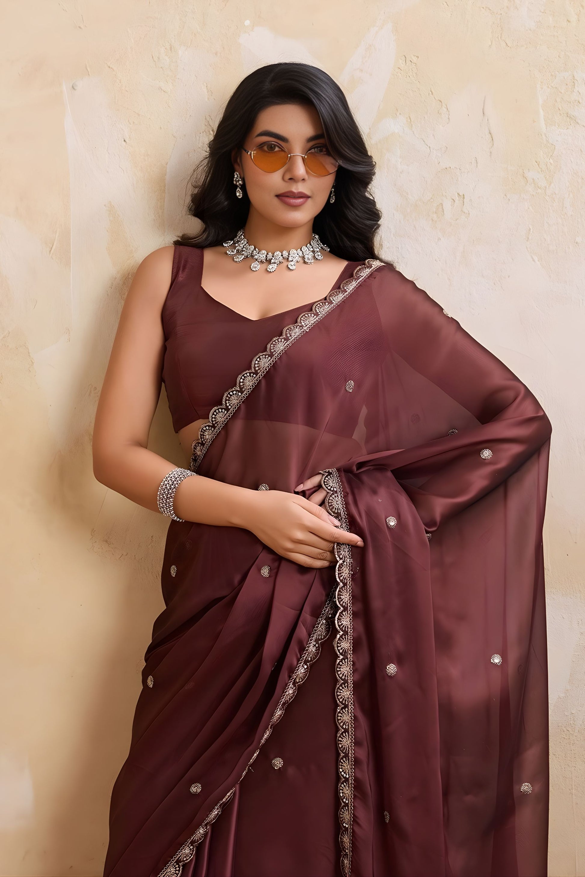 Step into timeless elegance with this Wine Brown Georgette Saree with Silver Zari Border Butti Work  a perfect blend of sophistication and traditional charm. Crafted from premium-quality georgette fabric, this saree offers a lightweight texture, smooth finish, and a beautifully flowing drape that enhances your overall look effortlessly. The rich wine brown shade adds depth and grace, making it an ideal choice for weddings, festive celebrations, receptions, engagement ceremonies, and evening parties. The saree is adorned with delicate silver butti work spread across the body, creating a subtle shimmer effect. The intricate silver zari lace border gives it a refined designer finish, elevating its luxurious appeal.
