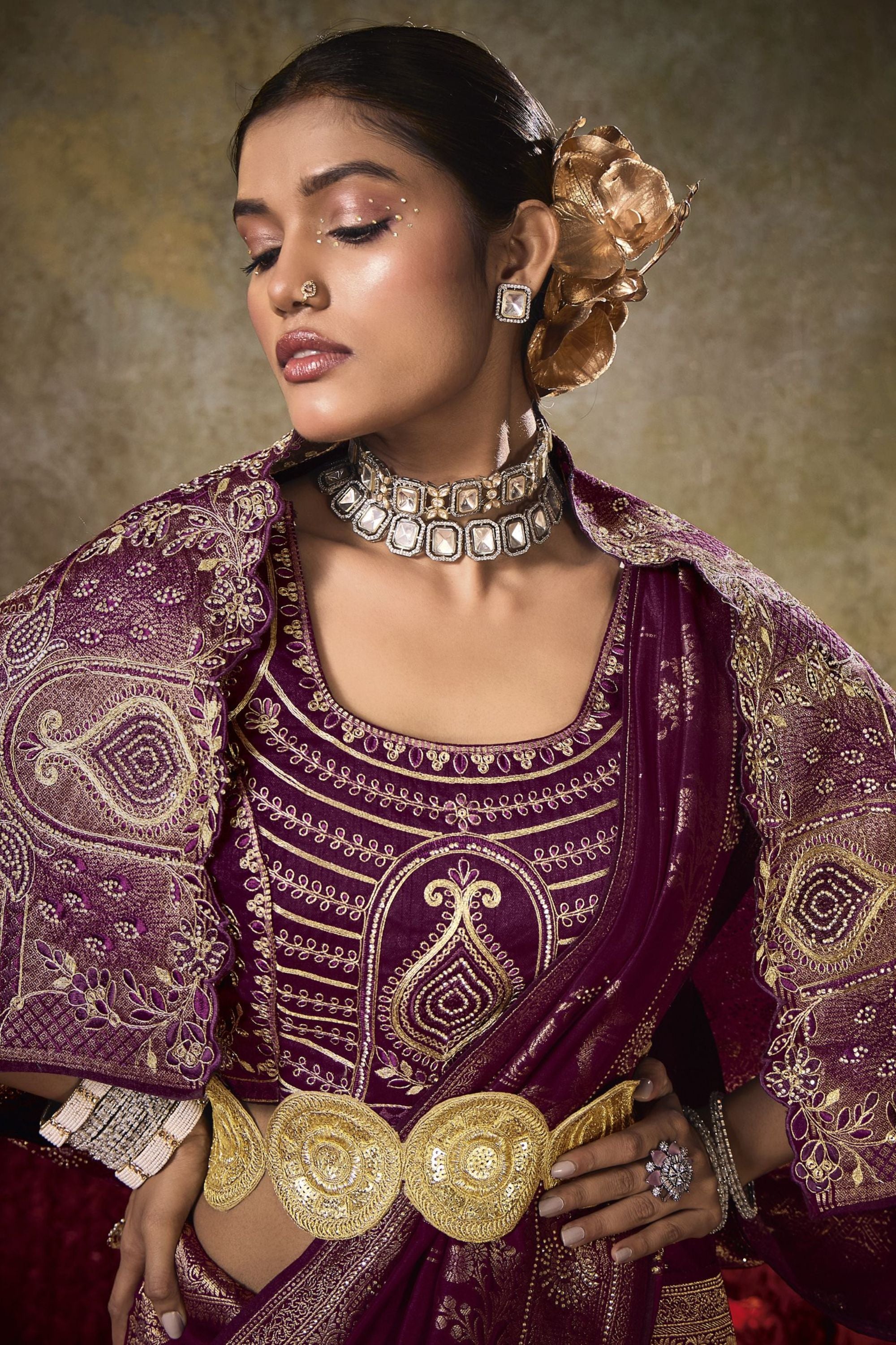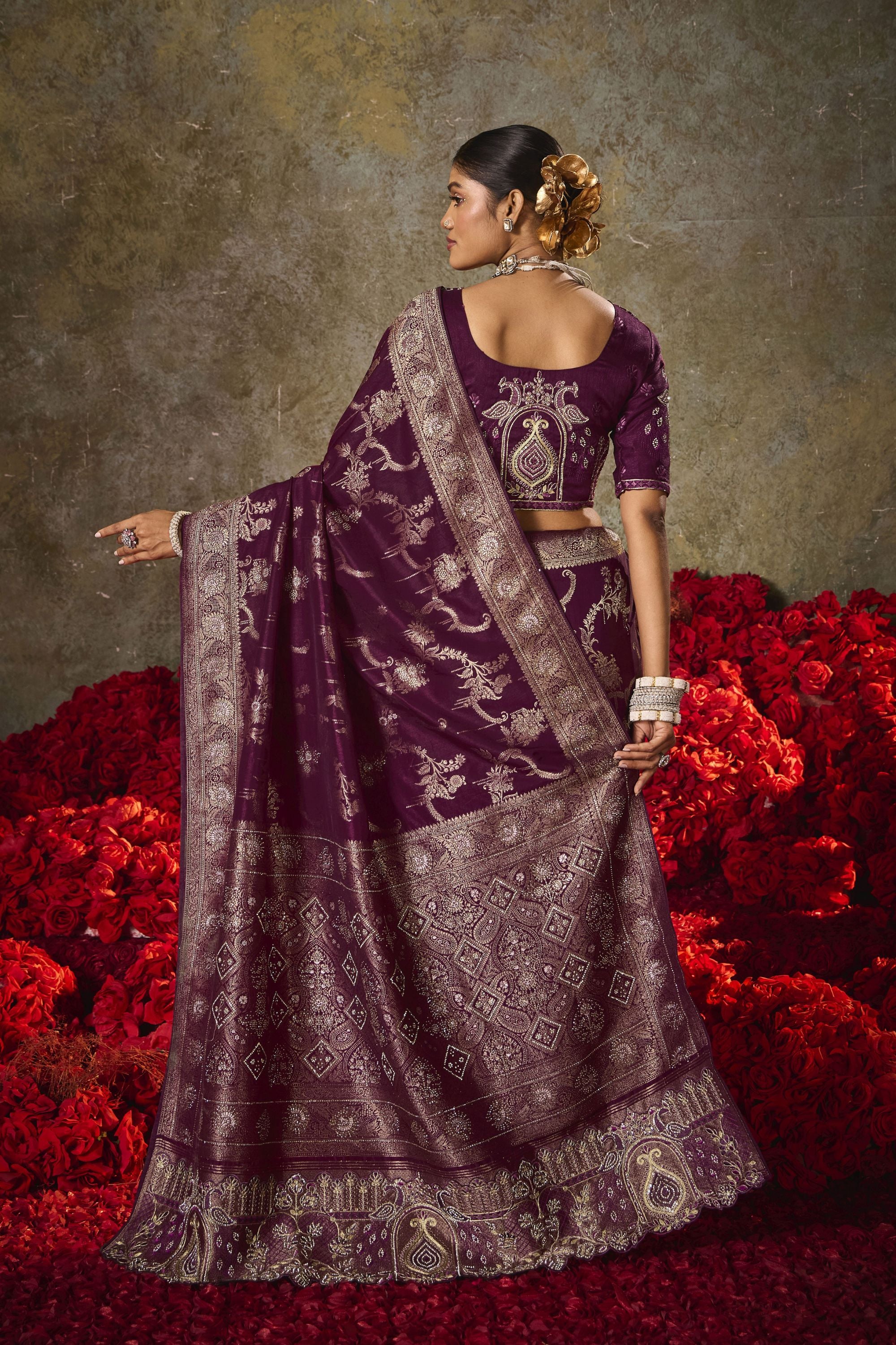 Wine Purple Banarasi Silk Saree Heavy Gold Zari Weaving Embroidered Blouse