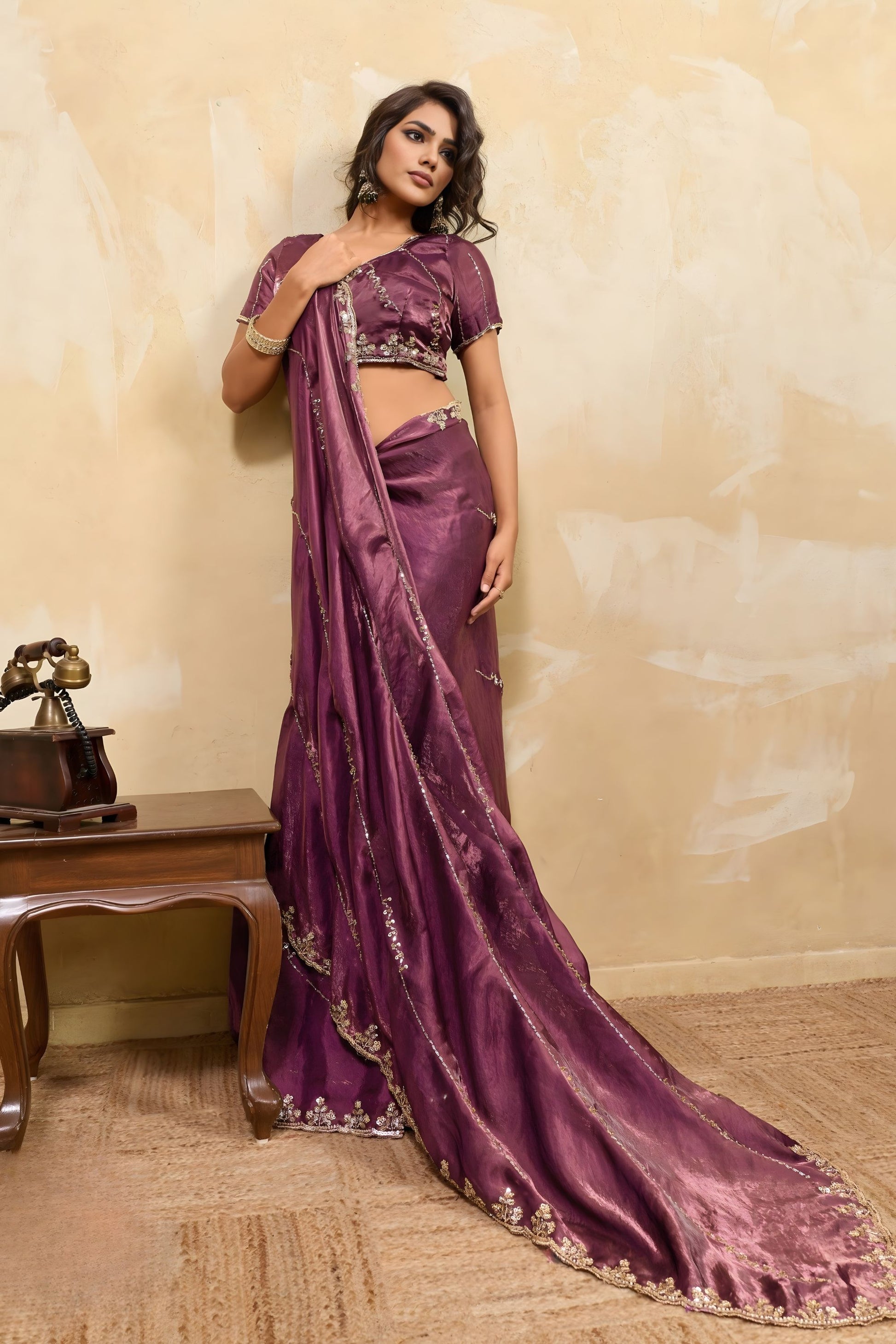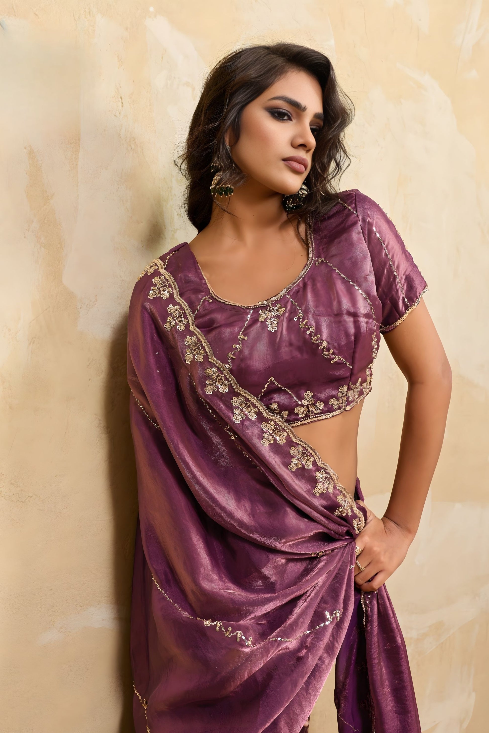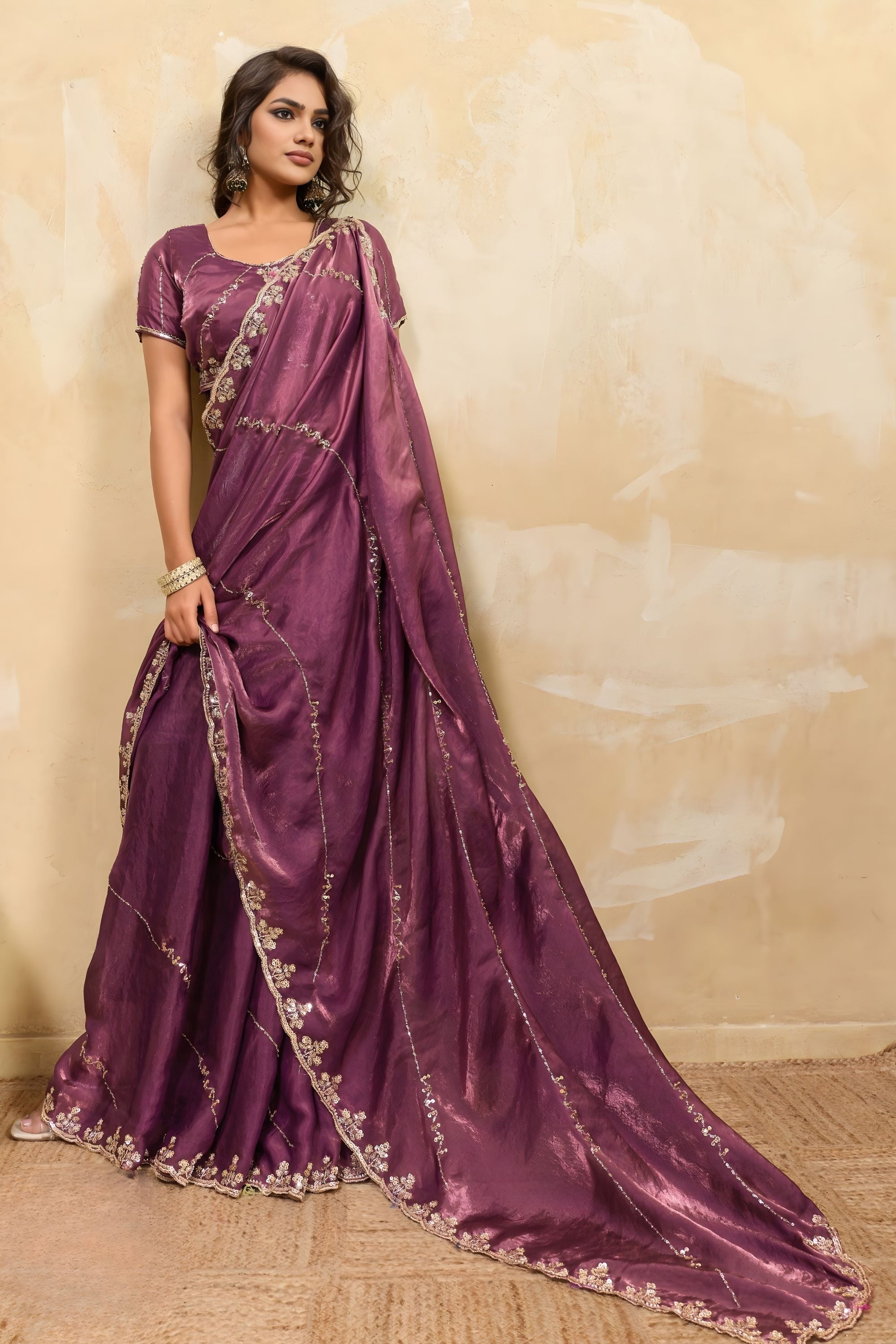 Add a touch of royal elegance to your ethnic collection with this stunning Wine Purple Silk Blend Saree Golden Zari Embroidery Designer Blouse  Designed for women who appreciate timeless beauty and refined craftsmanship, this saree perfectly blends traditional charm with modern sophistication. Crafted from premium silk blend fabric, the saree features a rich wine purple shade with a graceful sheen that enhances its luxurious appeal. The intricate golden zari embroidery along the borders and delicate detailing across the body create a beautifully balanced festive look. The finely embroidered border and subtle embellishments add depth and richness, making it ideal for grand celebrations.