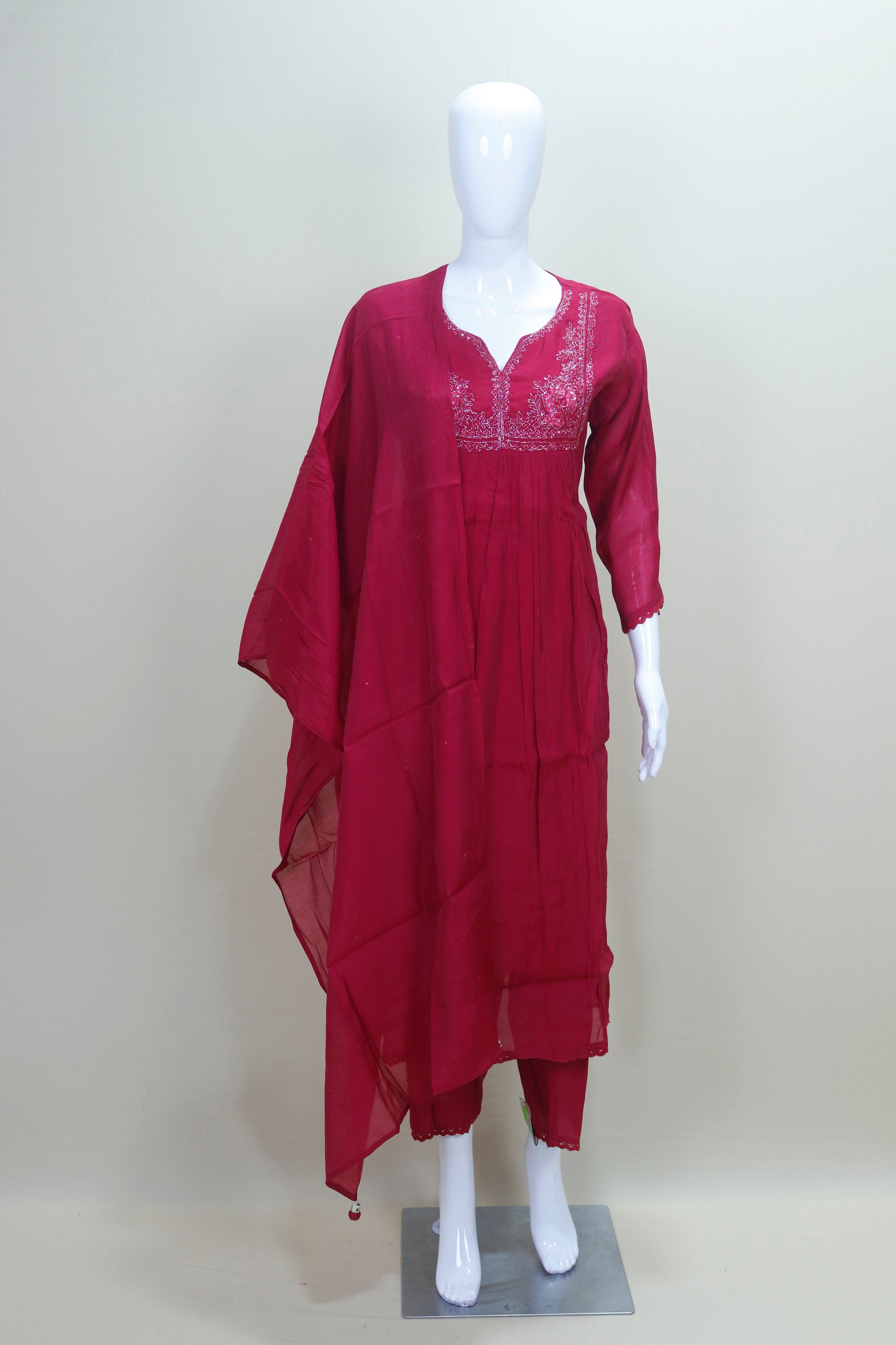 Add a rich, regal touch to your ethnic wardrobe with this elegant Wine Red Georgette Kurta Set with Embroidered Neckline and Dupatta, designed for festive flair and everyday grace. The kurta features a flattering gathered silhouette with a delicately embroidered neckline and subtle sequin accents, creating a perfect blend of tradition and style. Paired with straight-fit pants and a lightweight matching dupatta, this three-piece ensemble is ideal for festive celebrations, cultural gatherings, and special occasions. Crafted in soft, flowy georgette, this outfit offers both style and comfort. Pair it with oxidized jewelry and ethnic footwear for a complete, sophisticated ethnic look.