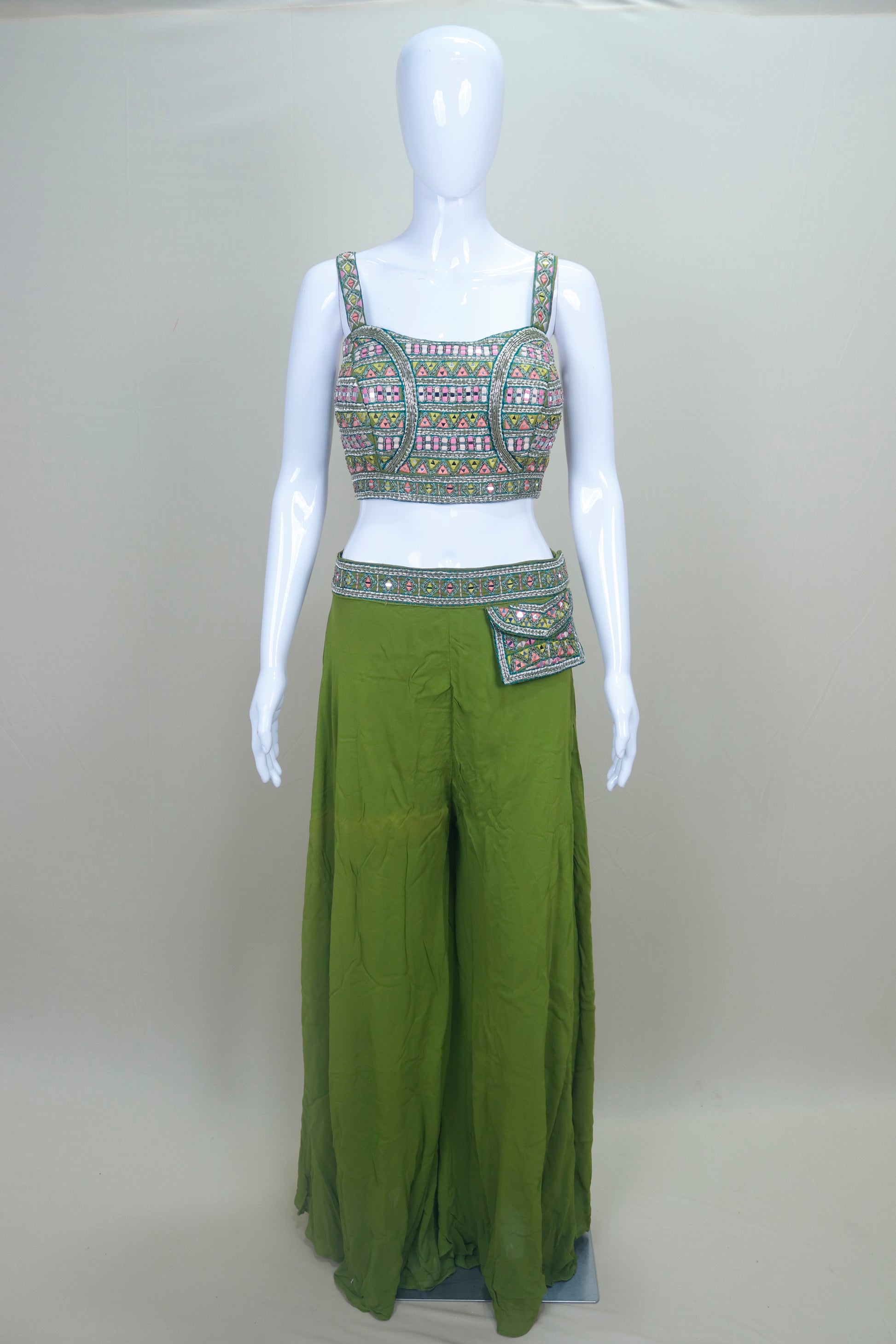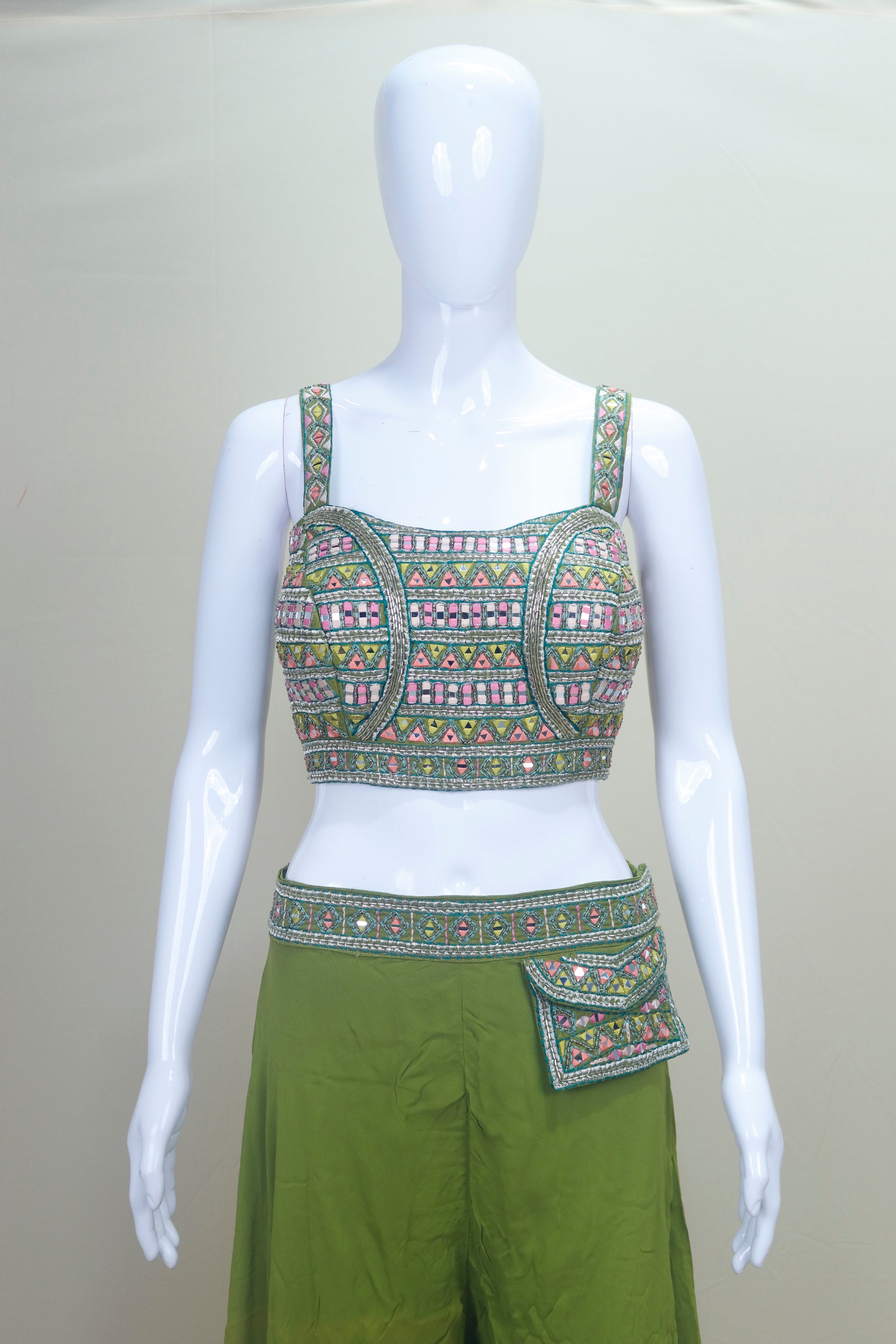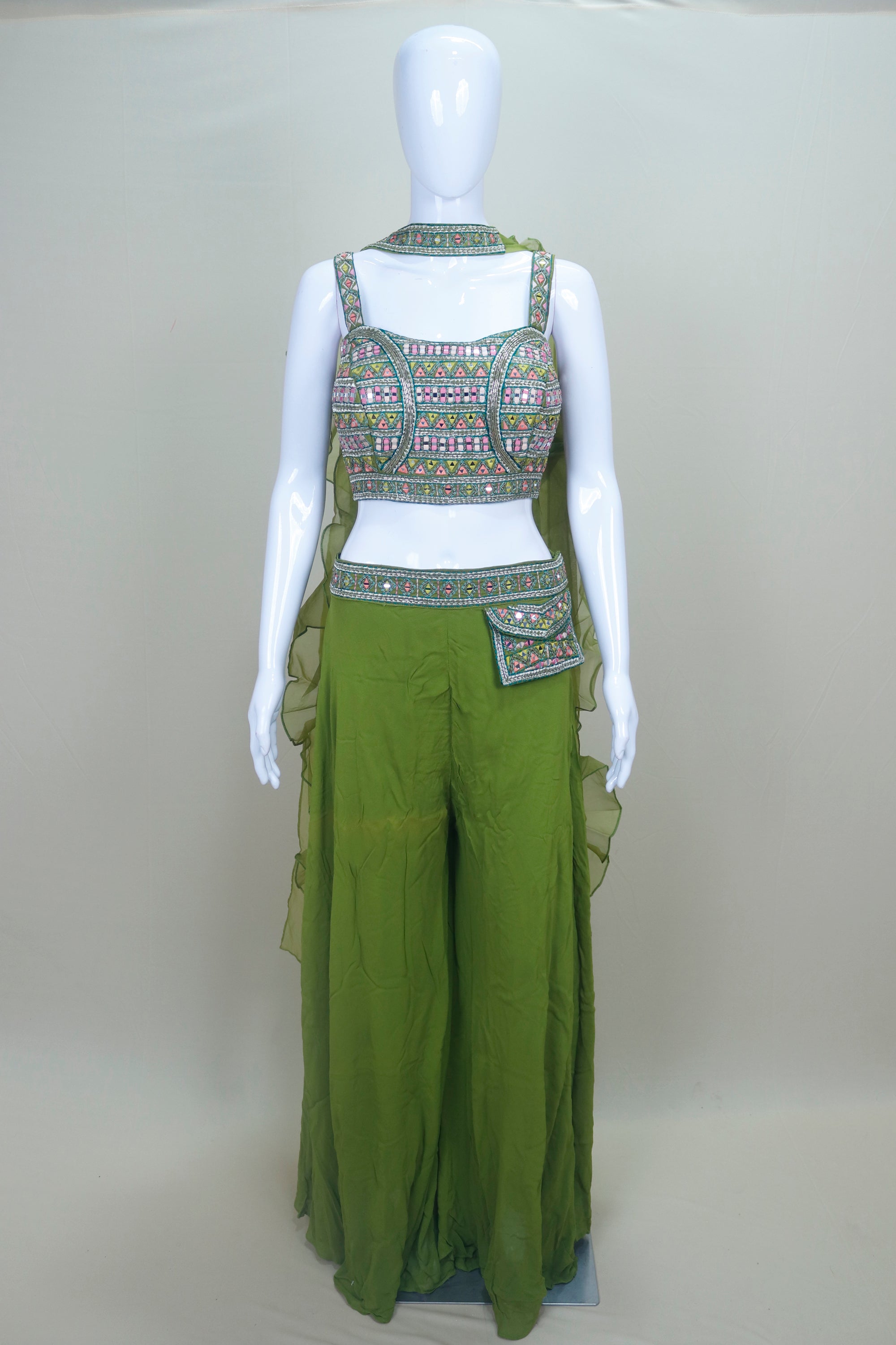 Women's Green Mirror Work Embroidered Crop Top with Palazzo Pants and Dupatta