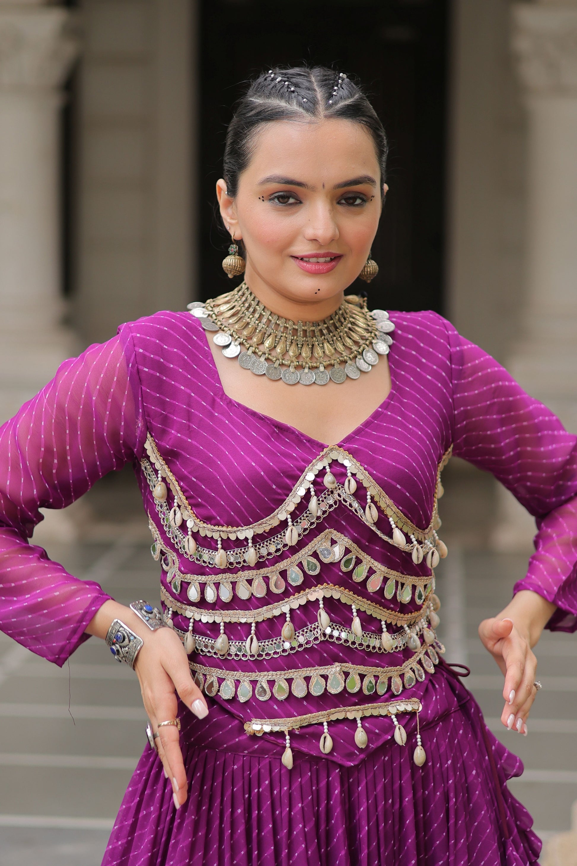 Celebrate in style with this Wonderful Purple Bandhani Print Faux Georgette Lehenga Choli with Mirror Work and Golden Border. Crafted in soft and flowy faux georgette, this lehenga choli features a traditional Bandhani print paired with dazzling mirror embellishments on the blouse for a festive sparkle. The flared lehenga with its elegant golden lace border creates a graceful silhouette, perfect for twirls and dance celebrations. An ideal choice for Navratri, weddings, sangeet, garba nights, festive occasions, and cultural events, this lehenga choli blends traditional charm with modern elegance. Style it with statement jewelry and ethnic footwear for a glamorous festive look.