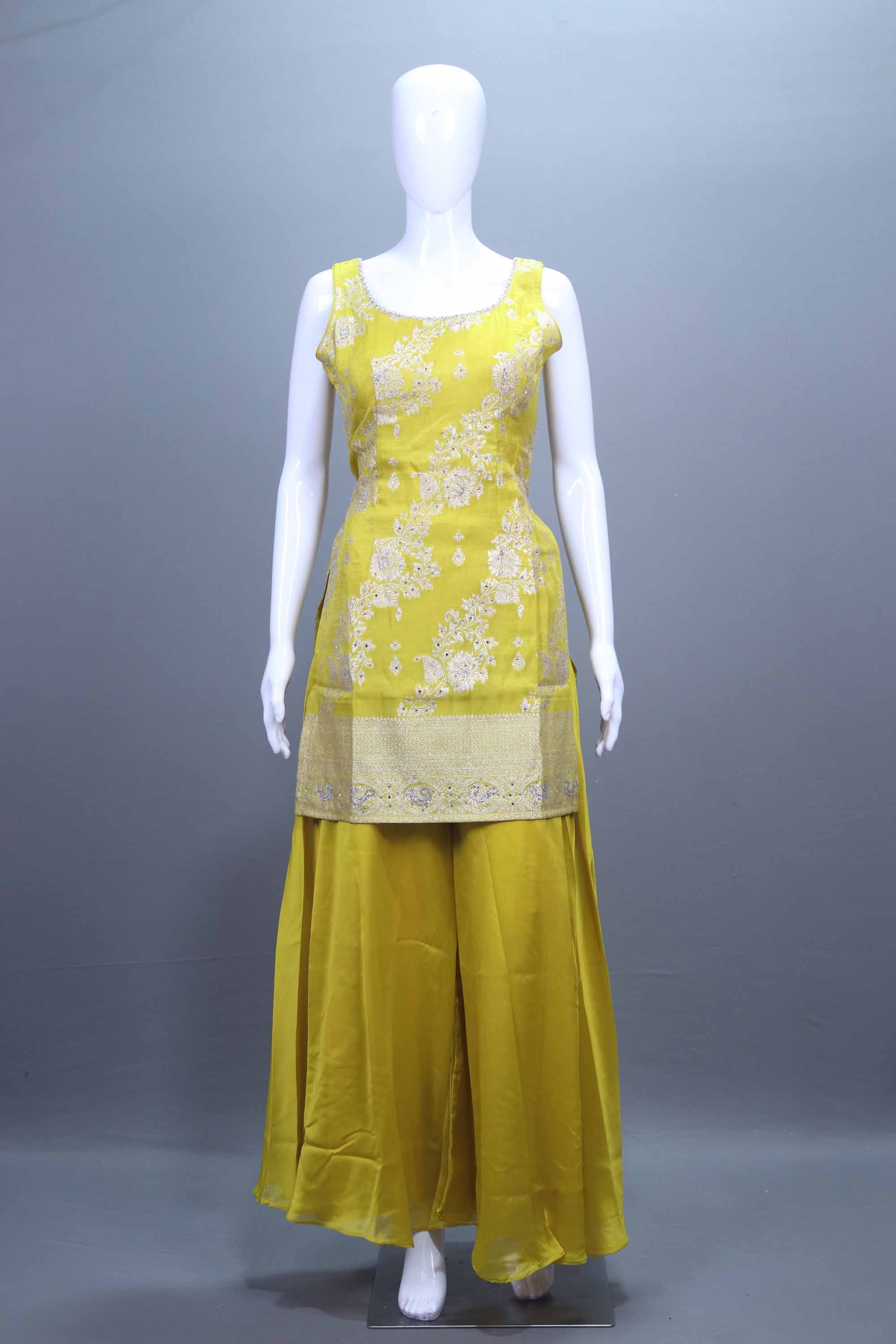 Elevate your festive and wedding wardrobe with this stunning Yellow Embroidered Kurta Sharara Set with Dupatta Festive Wear . Crafted from soft, flowy fabric, this elegant ethnic outfit features a beautifully detailed sleeveless kurta adorned with intricate floral embroidery and delicate zari work along the neckline and hem. The matching sharara pants offer a graceful silhouette, while the lightweight dupatta with subtle embroidered edging completes the traditional yet stylish look. Perfect for festivals, weddings, haldi ceremonies, family functions, and special occasions, this vibrant yellow suit set ensures comfort with sophistication. Its premium-quality stitching and eye-catching craftsmanship make it a must-have addition to your ethnic collection.