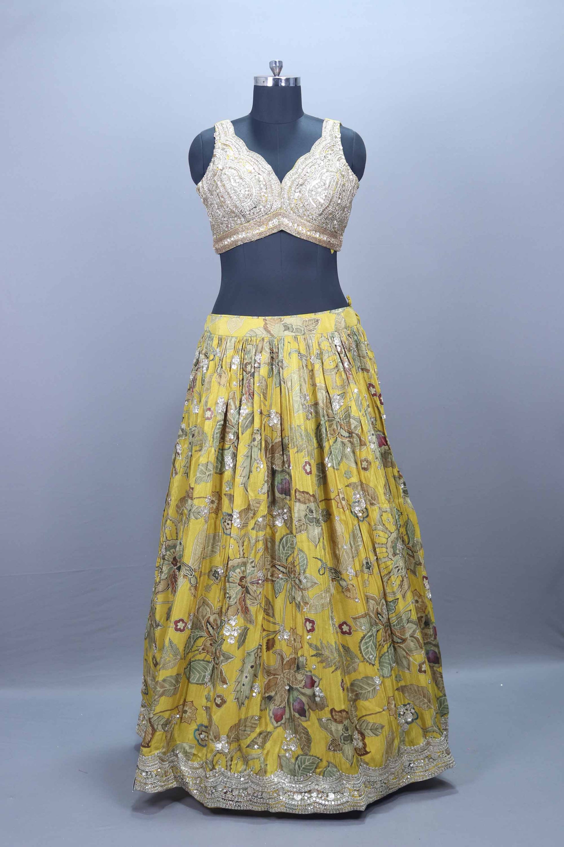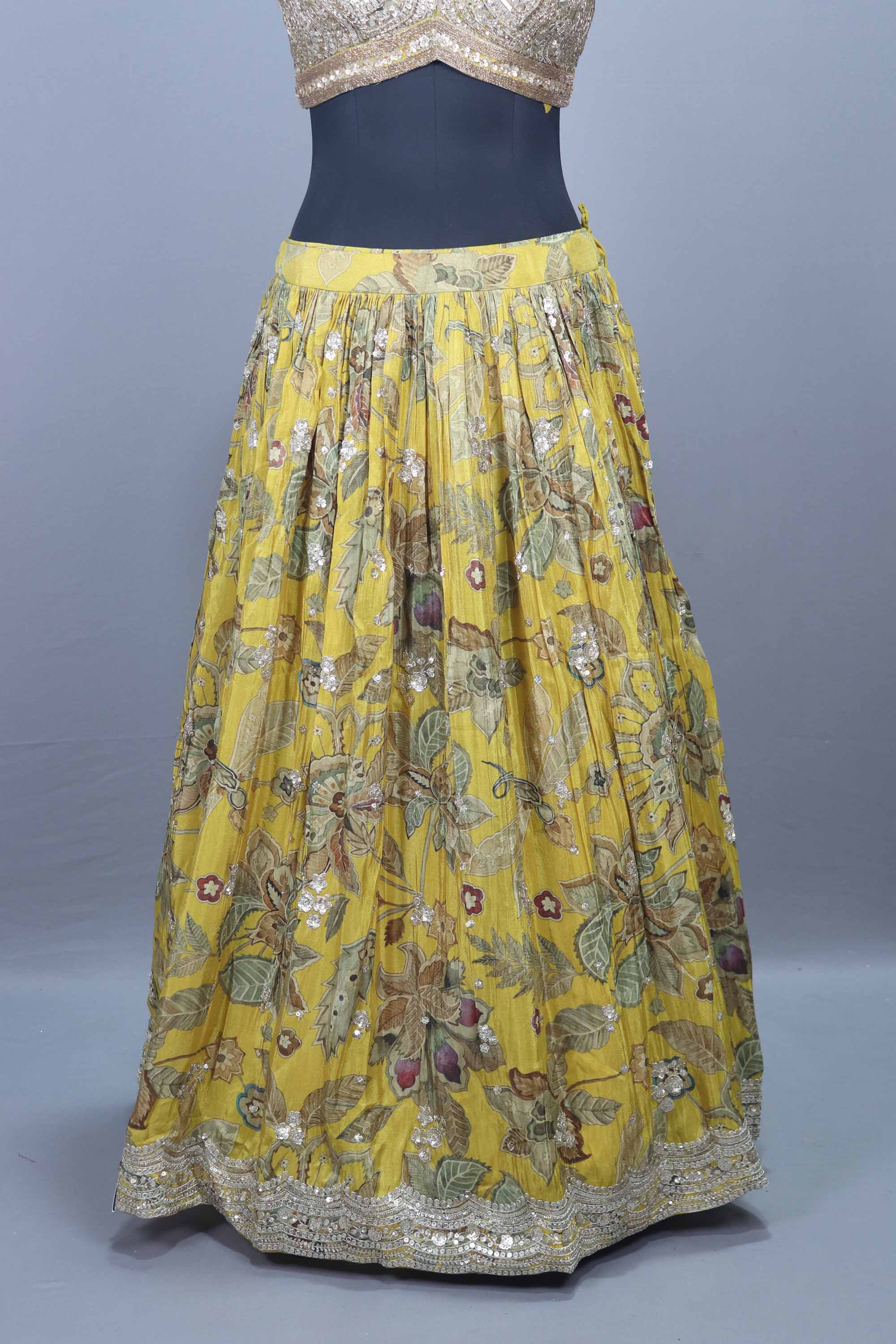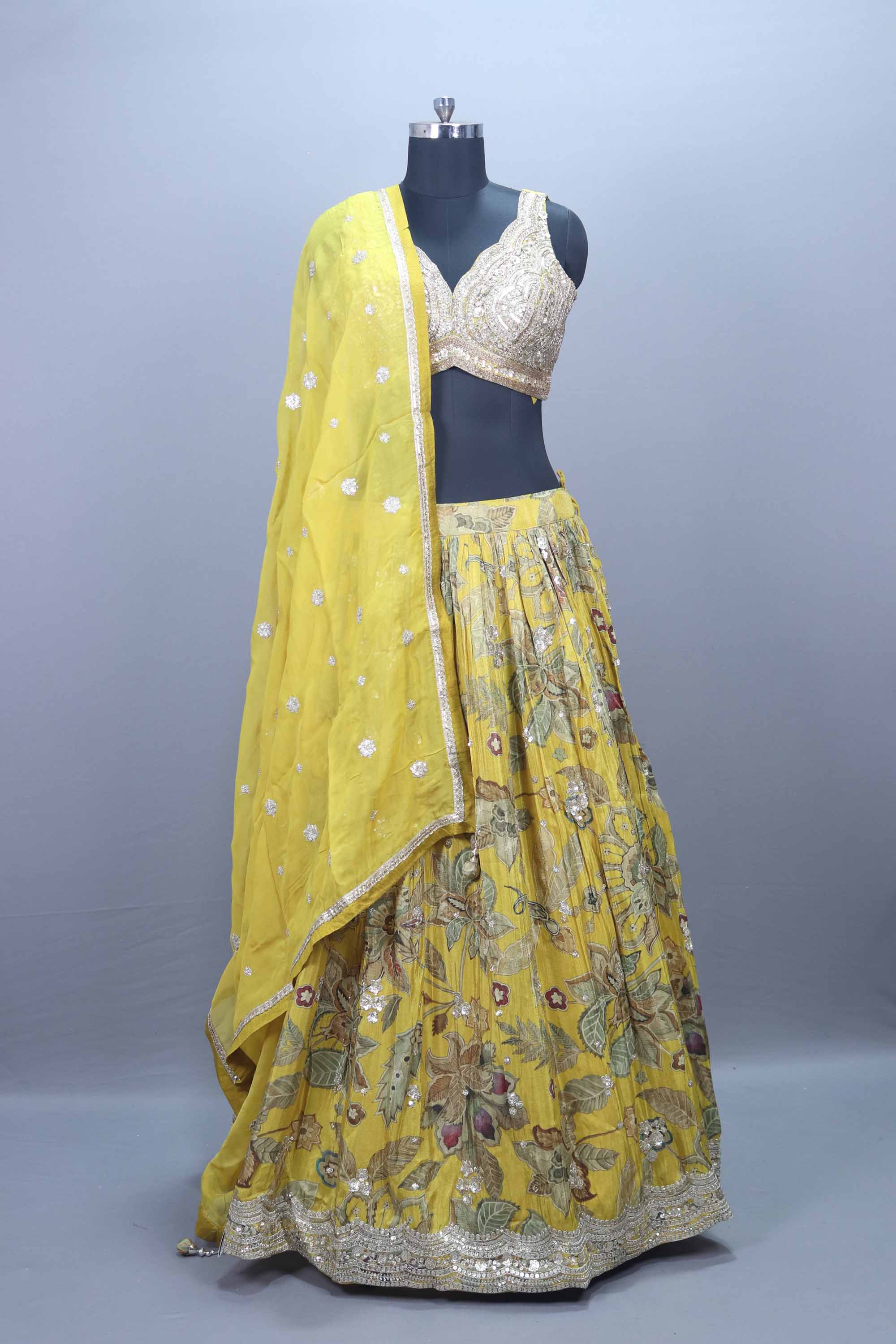 Elevate your festive elegance with this Yellow Floral Embroidered Designer Lehenga Choli with Dupatta crafted to make you stand out at weddings, haldi ceremonies, sangeet nights, and festive celebrations. The lehenga features intricate multicolor floral embroidery, enhanced with shimmering sequin work that adds a touch of glamour to every twirl. The embellished blouse comes with a hand-crafted sequin and zari design, offering a rich and luxurious appeal. Paired with a lightweight yellow dupatta adorned with delicate embroidered motifs and a shimmering border, this ensemble blends tradition with contemporary charm.