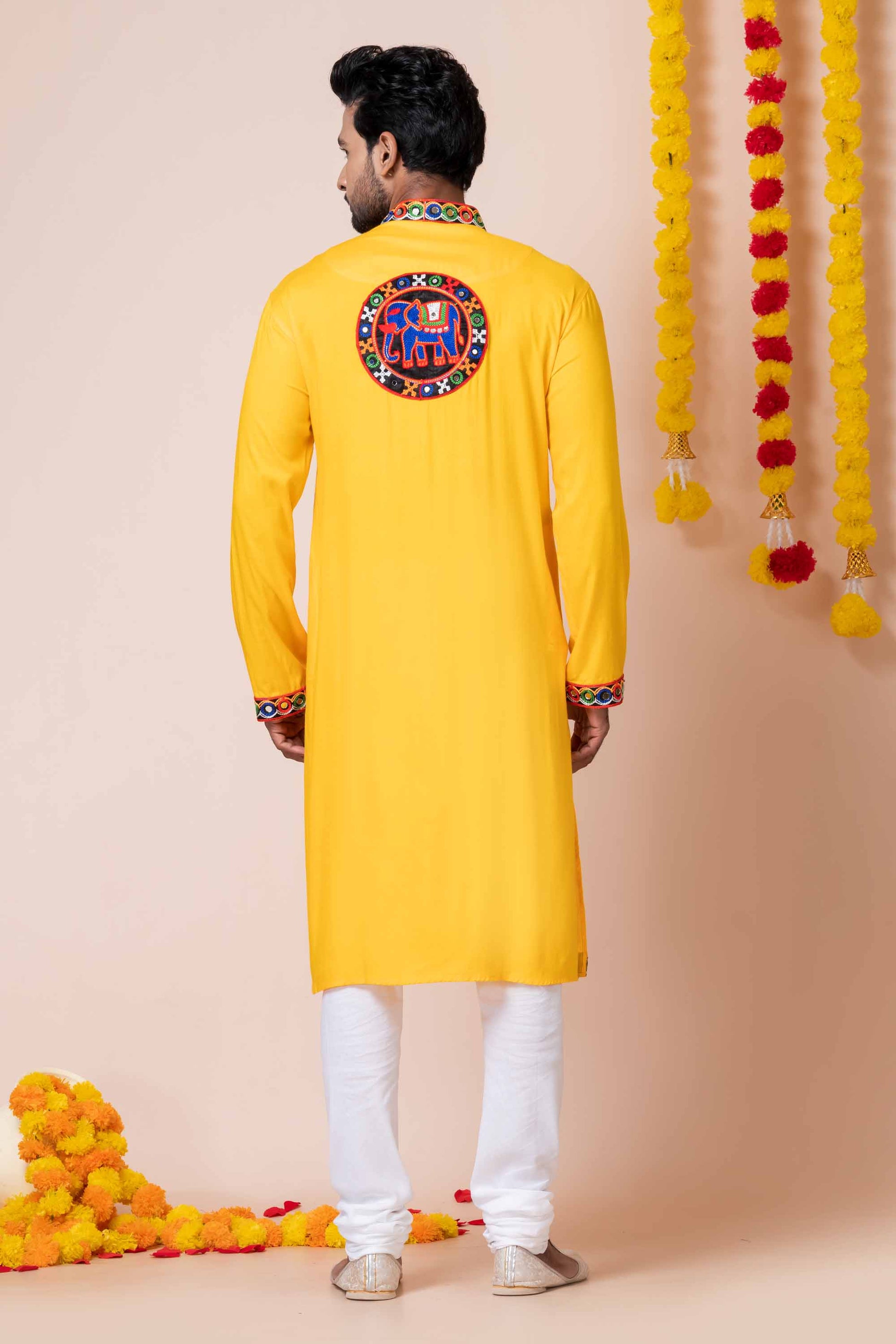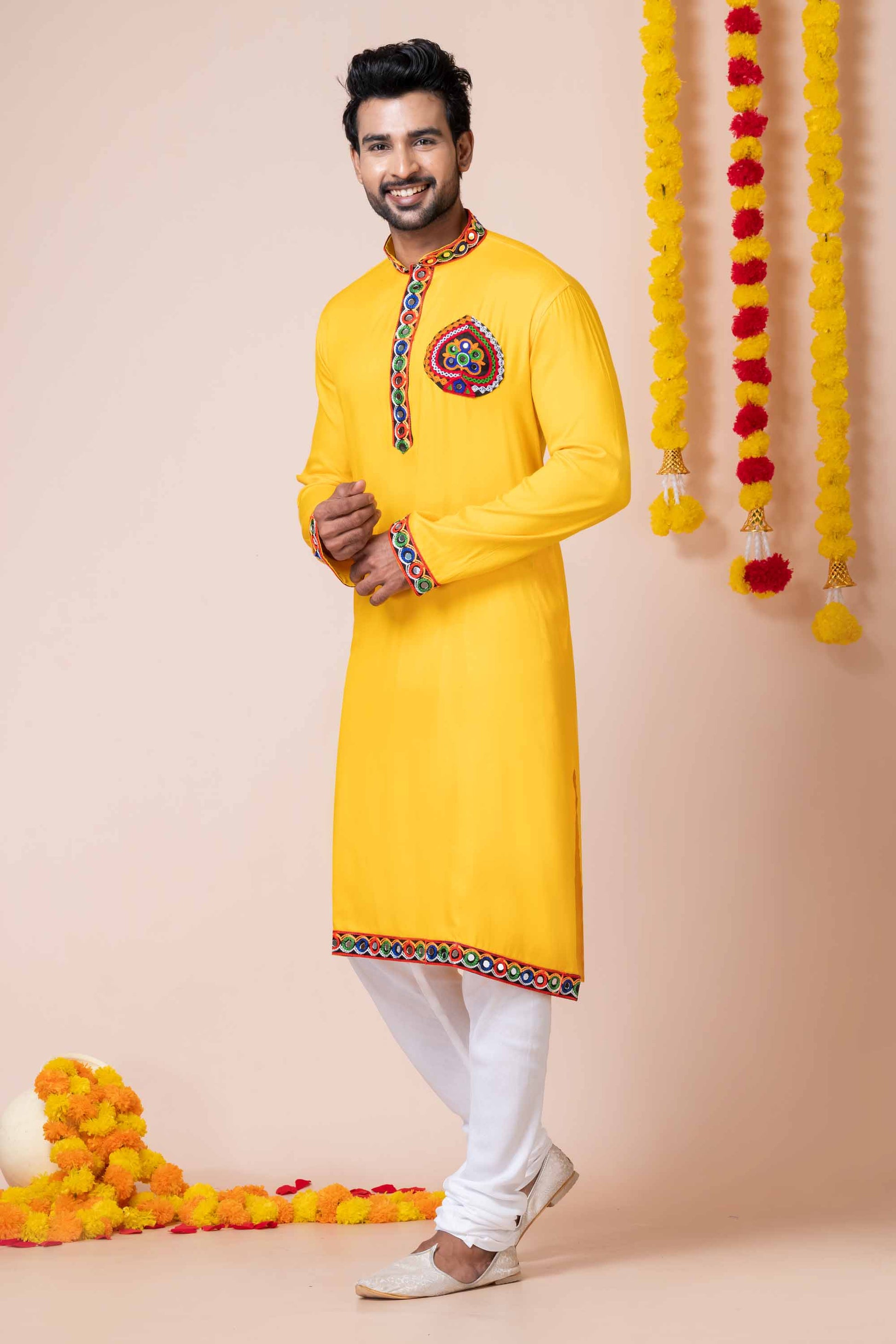 Brighten up your festive wardrobe with this vibrant Men's Yellow Rayon Kurta, beautifully adorned with Multicolor Mirror and Thread Embroidery. Designed especially for Navratri and Garba nights, this kurta blends traditional artistry with modern comfort. The colorful mirror work on the placket, cuffs, hem, and chest adds a striking ethnic flair, making it a perfect choice for cultural and festive events.
