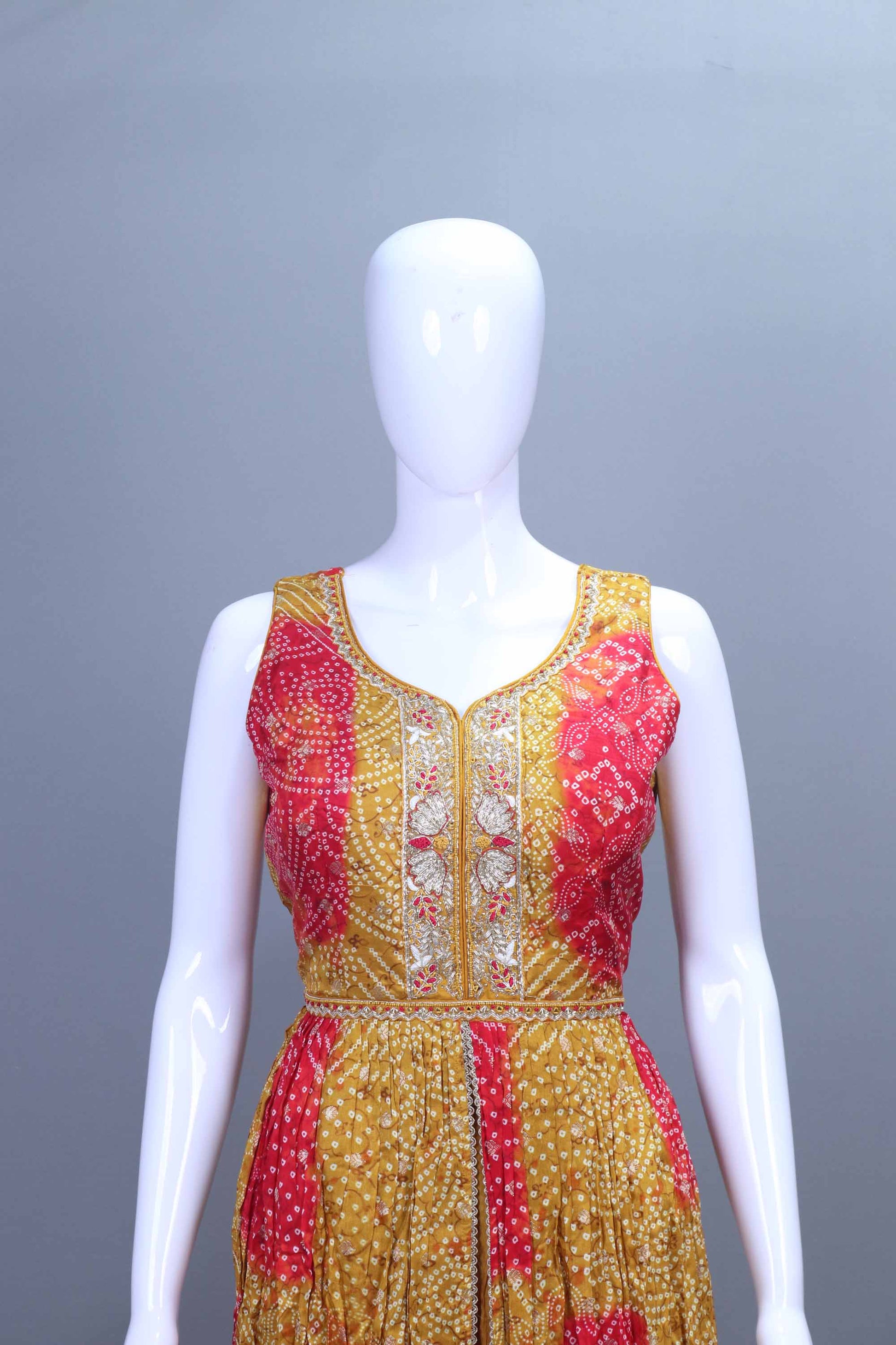 Step into elegance with this Yellow Red Bandhani Sharara Suit Designer Outfit Wear beautifully designed for festive and wedding occasions. Crafted from premium georgette fabric, this stunning outfit features traditional Bandhani print enhanced with intricate mirror and gota patti work. The sleeveless kurta paired with a matching sharara and lightweight dupatta adds a royal touch to your ethnic wardrobe. Perfect for Haldi, Mehendi, and festive celebrations, this outfit combines comfort with rich traditional craftsmanship.